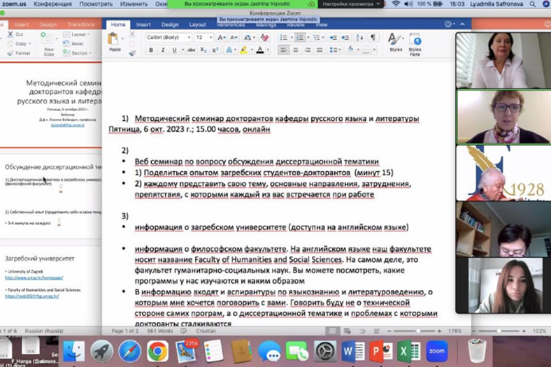 On October 6, 2023, a methodical seminar of doctoral students of the Department of Russian Language and Literature of the Institute of Philology was held to discuss dissertation topics. The moderator was Professor Jasmina Vojvodic of the University of Zagreb, Croatia.
