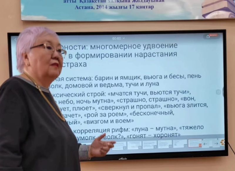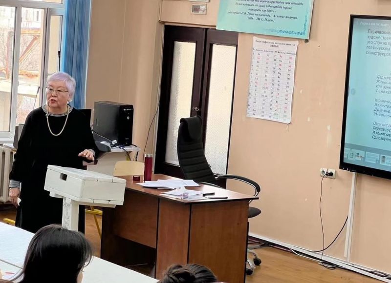 Within the framework of the Decade of Science - 2024, an assembly lecture was held by the Head of the Department of Russian Language and Literature, Doctor of Philology, Professor S.D. Abisheva on the topic "Lyrics as a kind of literature" for the 3rd year of the specialty 6B01702 - Russian language and Literature. The explanation of the complex theoretical material was based on the material of the poetry of A.S. Pushkin, who turns 225 years old this year. Interactive conversation with students, discussion of the meaning of the poems demonstrated a high level of presentation of theoretical information and examples to it. Watching a video on the topic of the lecture created a warm atmosphere of immersion in the world of poetry by A.S. Pushkin. The lecturer drew attention to the need to take into account the biographical aspect when analyzing a lyrical work. The teachers of the department who attended S.D. Abisheva`s lecture noted that the professor demonstrated academicism, professionalism and pedagogical skills, and the students during the lecture showed understanding and interest in such an important university discipline as literary theory.