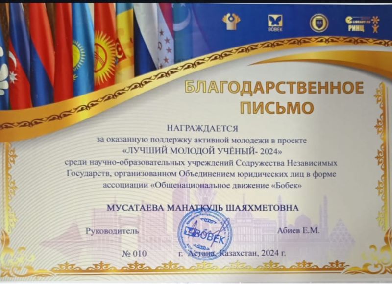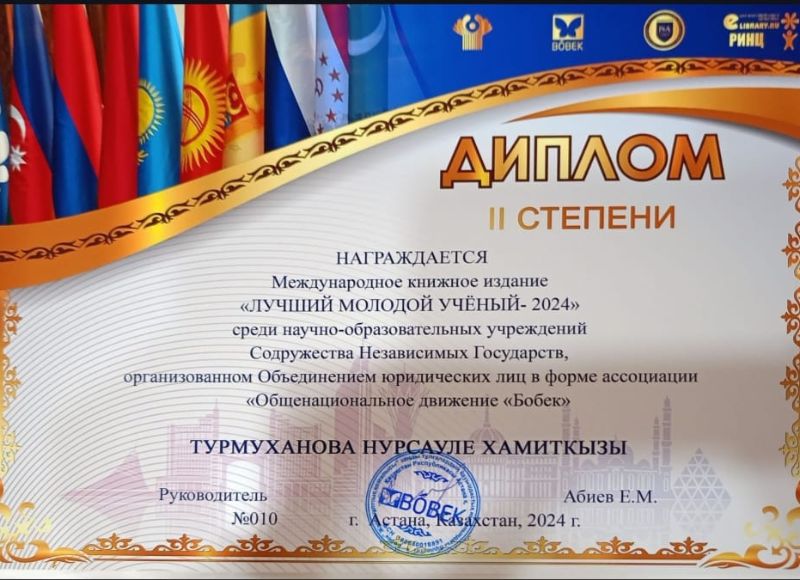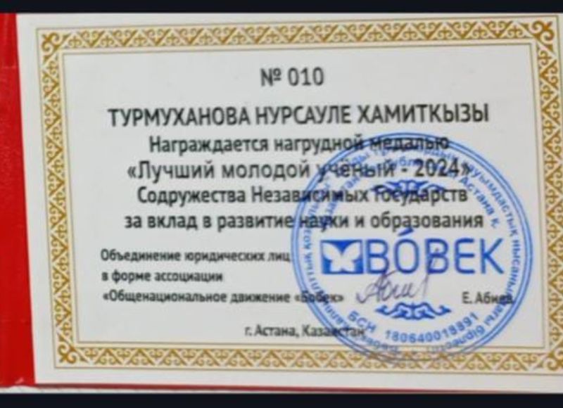 A student of Abai KazNPU was recognised as the best young scientist of the CIS Student of the Department of Russian Language and Literature Turmukhanova Nursaule under the guidance of Doctor of Philology, Professor M.Sh.Musataeva became the winner of the competition "Best Young Scientist-2024" among scientific and educational institutions of the CIS, organised by the "Nationwide Movement "Bobek" and was awarded the medal "Best Young Scientist-2024" CIS for her contribution to the development of science and education. Congratulations!