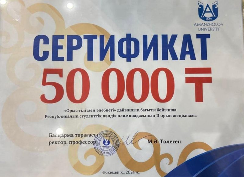 Despite the high competition, 4th year students of the specialty "Russian language and literature" under the guidance of their teachers Sabirova D.A., Irgebayeva A.B., Kuatova G.A., Khavaidarova M.M., Polyak D.M. and under the guidance of the head of the department, Doctor of Philological Sciences, Professor Abisheva S.D. showed a decent level of knowledge and creativity, taking the honourable II place in the team competition and winning a certificate for the amount of 50 000 tg.