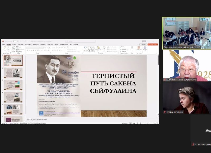 Literary lounge "The Thorny path in the life and works of Saken Seifullin" On October 18, 2024, the Russian Language and Literature Department of the Faculty of Philology of Abai KazNPU and specialized lyceum №165 of Almaty in the framework of the scientific project "History in Faces and Fates: Outstanding Philologists of Abai University" held a literary lounge on the theme "The Thorny Path of Saken Seifullin", dedicated to the 130th anniversary of the birth of the poet, writer Saken Seifullin. This literary evening was organized to respect the outstanding writer personality of the Kazakh people and to popularize the life path and creativity of the public figure among the modern generation.