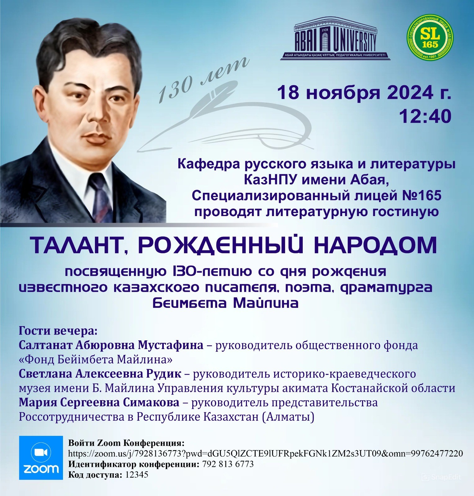 Literary lounge "Talent born by the people" On November 18, 2024 the Russian Language and Literature Department of Abai KazNPU together with specialized lyceum №165 within the framework of cooperation with schools will hold a literary lounge dedicated to the 130th anniversary of the famous Kazakh writer, poet and playwright Beimbet Mailin.