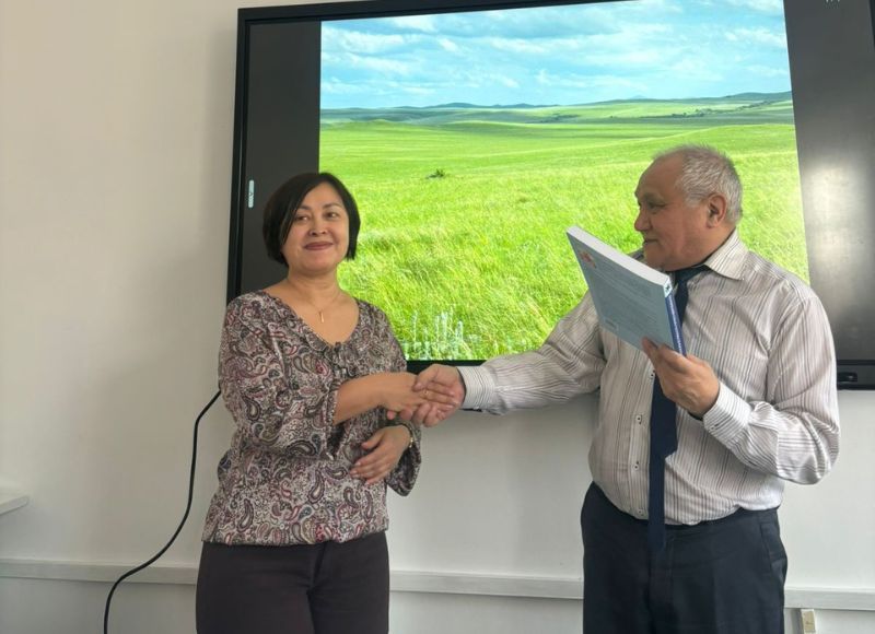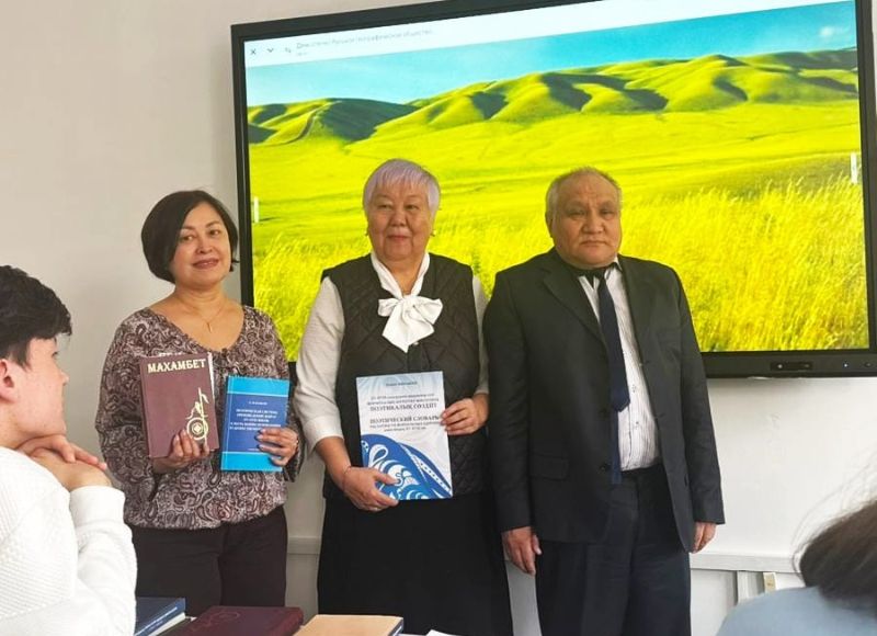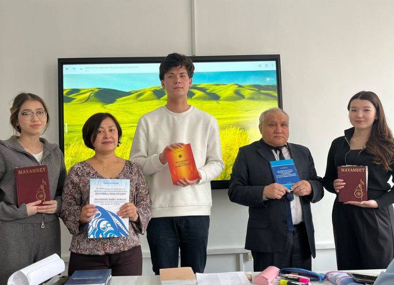 At the end of the meeting poet-translator Kairat Zhanabaev presented his books to the staff of the department and the best students, participants and winners of scientific conferences and Olympiads. The author also presented the fundamental "Poetic Dictionary of formulaic units: the language of Zhyrau XV-XVIII centuries" to the chair. At the end of the meeting the students, teachers and the guest of the event were photographed and wished each other success in labour and comprehension of knowledge.