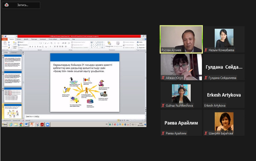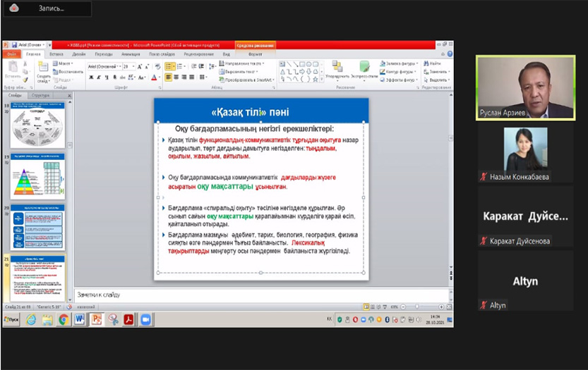 The speaker gave brief information about the importance, prerequisites for updating the content of secondary education in the Republic of Kazakhstan. Then R. Arziev dwelled on the structure, content of standard curricula of the updated content in the subjects «Kazakh language» and «Kazakh literature» at the levels of basic and secondary general education. The programs especially noted that the basic skills in the disciplines «Kazakh language» and «Kazakh literature» and the system of educational goals leading to them were created on the basis of the best national and international practices, which, in fact, form competitive individuals. In addition, the speaker noted that teachers are provided with additional teaching materials at a level sufficient for the effective organization of the lesson based on educational goals.