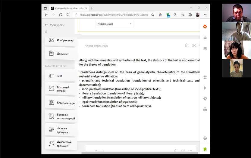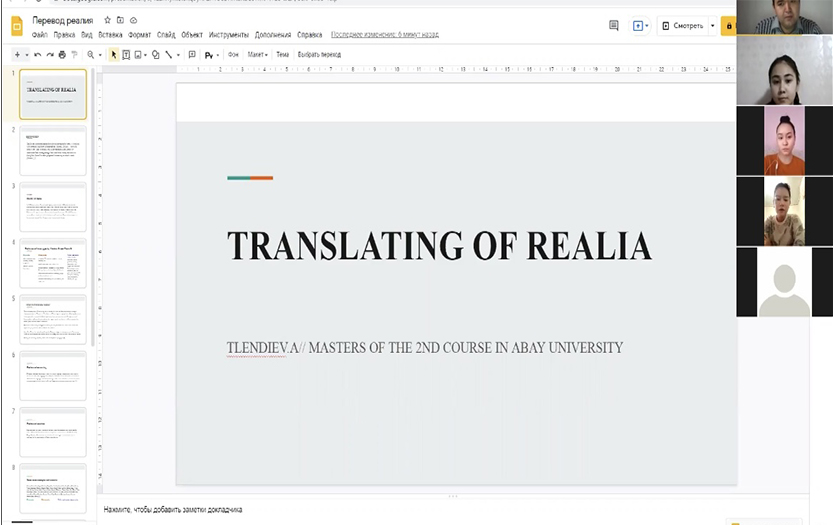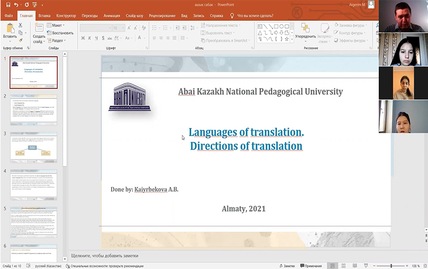 The Preliminary Conference was held on November 8, 2021; the aims, objectives and structure of pedagogical internship were explained to Master`s Degree Students. Since November 19, they have begun to conduct open lessons. According to the requirements of the pedagogical internship program, its participants had to attend open lessons and assign a grade to students of Bachelor`s program. All candidates for a master`s degree conducted open classes in English: Tussupova Zhanara - «The lost generation writers: Fitzgerald, Hemingway» - 19.11.21; Tlendiyev Ardak- «Translation of realia» - 26.11.21; Kairbekova Aigerim - «Languages of translation. Directions of translations» - 29.11.21; Nasibullina Zulfira - «Stylistic features of translation» - 3.12.21; Baltakara Arai - «Patent. Patent translation» - 3.12.21.