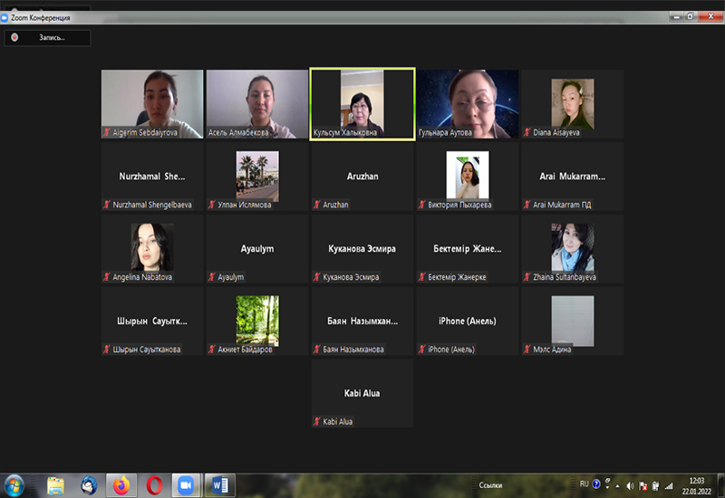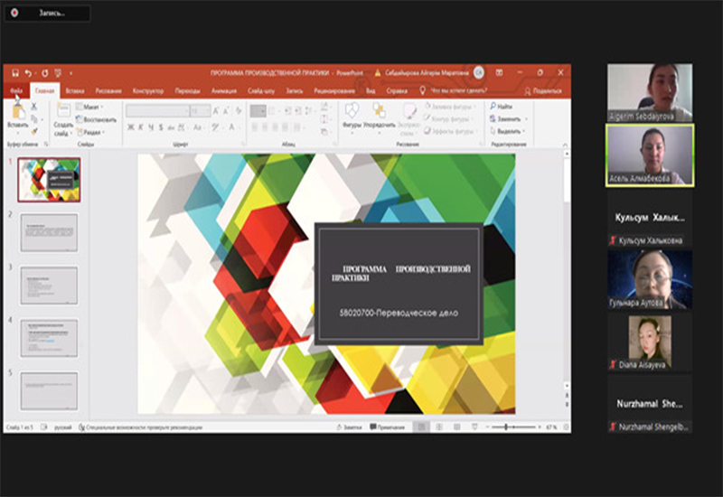 The conference on the opening of practice in these specialties was held online on the ZOOM platform on January 22, 2022. The event was attended by the head of the department Abdrakhmanova K.Kh., general director of LLP «Present PP» Burgambayeva N.T., senior teacher responsible for the practice in the department Almabekova A.M., methodologists - senior teachers Shengelbayeva N.R., Autova G .M., Sultanbayeva Zh.U., teachers Sebdayyrova A.M. and Islyamova U.A., as well as the trainees. During the conference, the goals and objectives, rules of practice were explained, students` questions were answered.