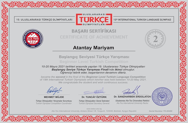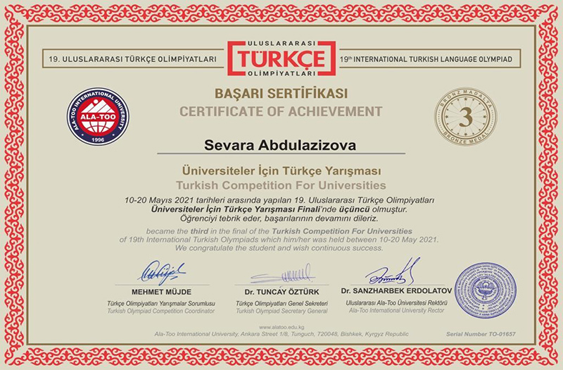 As previously reported, in May 2021, the 19th International Online Turkish Language Olympiad was held among university students. Representatives from more than 27 countries of the world participated in the Olympiad. The students of our university took the most active part, the evidence is that they took 1st, 2nd, 3rd prizes. Uglai Abdusattarova, 4th year student of the specialty 6B01703 Foreign language: two foreign languages (scientific supervisor, senior teacher Gulnaz Satbay) and 2nd year student Sevara Abdulazizova (scientific supervisor master, teacher N.Kh.Kospaganbetova) took 1st and 3rd places in C1 level. The 2nd year student Mariam Atantai (supervisor, senior lecturer Gulnaz Satbay) took the 2nd place in A1 level.