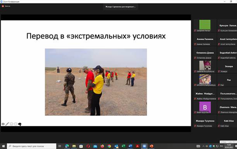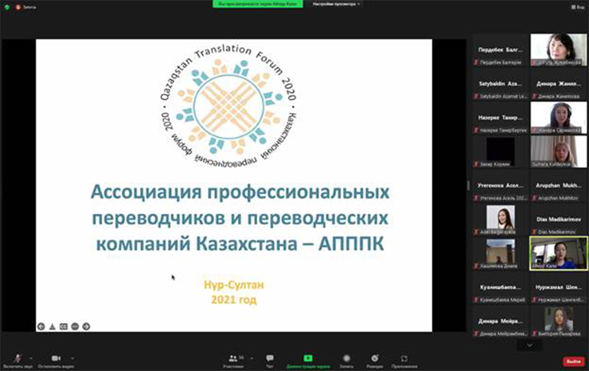 Professor of Oriental Philology and Translation Department, corresponding member of National Academy of Sciences of Kazakhstan A. Zhumabekova made the report «Scientific and methodical support of training of translators in Abai KazNPU». Professor of the theory and practice of translation at the university G. Kuldeeva spoke about the problems of training modern translators at the L.N. Gumilev ENU. The features of work under conditions of simultaneous interpretation were covered in the report of the senior teacher of KazSJU named after M.S.Narikbayev, acting interpreter-synchronist J. Sarmanova. A. Kali, an employee of the Association of Professional Translators and Interpreters, told about the activities of the republican «Association of Professional Translators and Interpretation Companies».