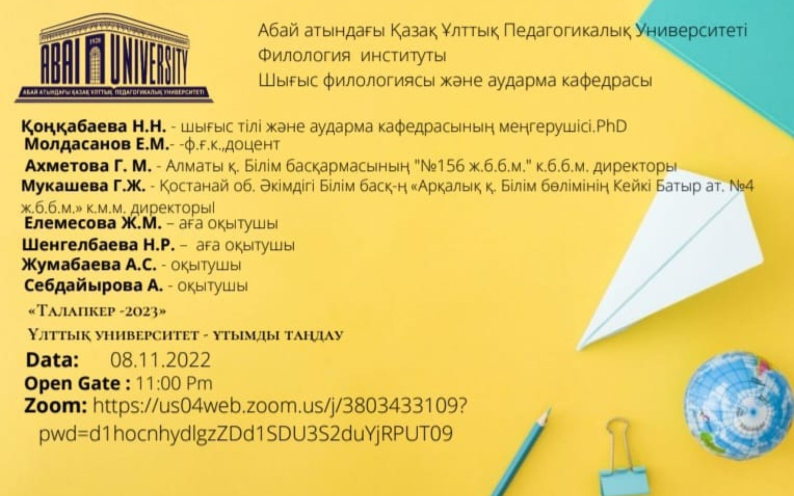 On November 9, 2022, as part of the professional orientation «Profession is the first step into the future», organized by the head of the Department of Oriental Philology and Translation, Institute of Philology, N.N. Konkabayeva and Senior Lecturers N.R. Shengelbayeva, Zh.M. Elemesova, A.M. Sebdaiyrova and A.S. Zhumabayeva held an online conference.