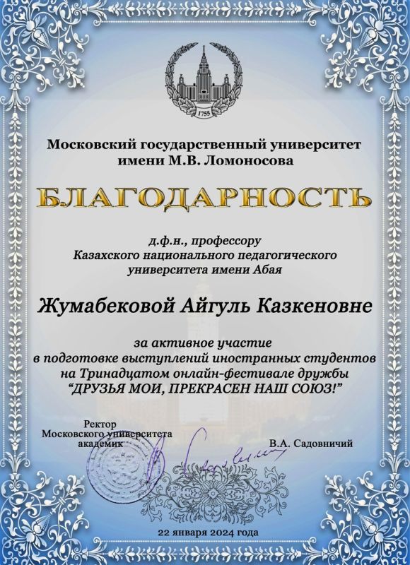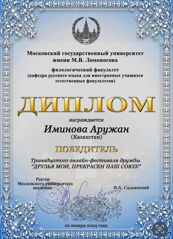 Iminova Aruzhan became the winner of the International Thirteenth Online Friendship Festival «My Friends, our union is beautiful!» organized by the Russian Language Department for foreign students of the Faculty of Philology of the Moscow State University named after M.V. Lomonosov. She is a student of 1 course of the Chair of Eastern Philology and Translation of the Institute of Philology of Abai KazNPU.