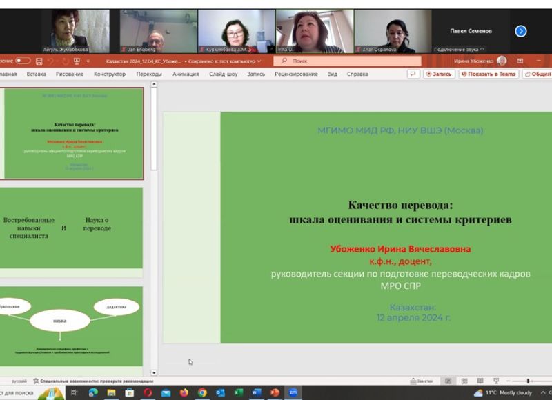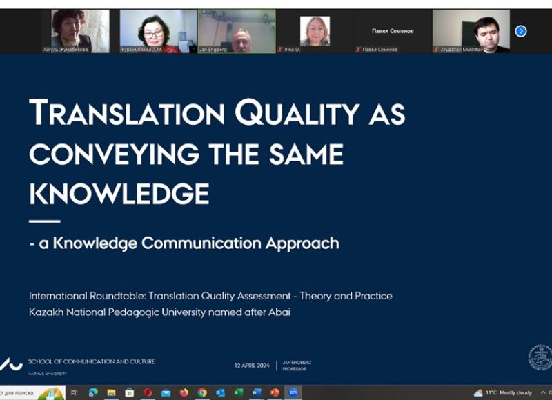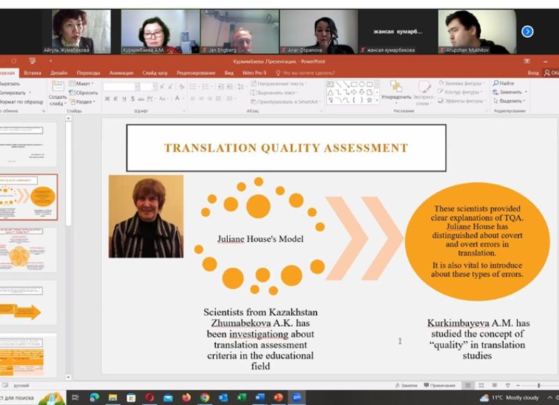 The speakers were: Jan Engberg - PhD, Full Professor at Aarhus University (Denmark), Knight of the Order of the Dannebrog and Honorary Doctor of the University of Vaasa (Finland) - "Translation Quality as the conveying the same knowledge - Knowledge Communicative Approach; Irina Vyacheslavovna Ubozhenko - Candidate of Philological Sciences, Associate Professor, head of the Translation Studies and Training Section of the Union of Translators of Russia, Associate Professor at the Higher School of Economics, Associate Professor at University of the Ministry of Foreign Affairs of the Russian Federation - "Translation quality: assessment scale and criteria systems"; Aigul Kazkenovna Zhumabekova - Doctor of Philology, Professor of Abai KazNPU, Corresponding Member of the National Academy of Sciences of Higher School of Kazakhstan- "The current state of the problem of assessing the quality of translation abroad and in Kazakhstan"; Aizhan Muratovna Kurkimbayeva - PhD, Head of the Department of Speech Practice of Foreign Languages KazUIRandWL named after Abylai Khan - "The Application of the J. House`s Model of Translation Quality Assessment in academic discourse"; Anar Lesbaevna Ospanova - Master of Atrs, Senior lecturer at the Department of Translation and Intercultural Communication of KazUIRandWL named after Abylai Khan - "Translation Quality Assessment and translation strategies from English to Kazakh"; Mukhitov Arupzhan Zumratovich - Master of Arts, lecturer at Abai KazNPU- "Questionnaire as a method of assessing the quality of translation by the target audience."