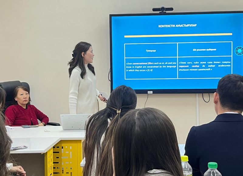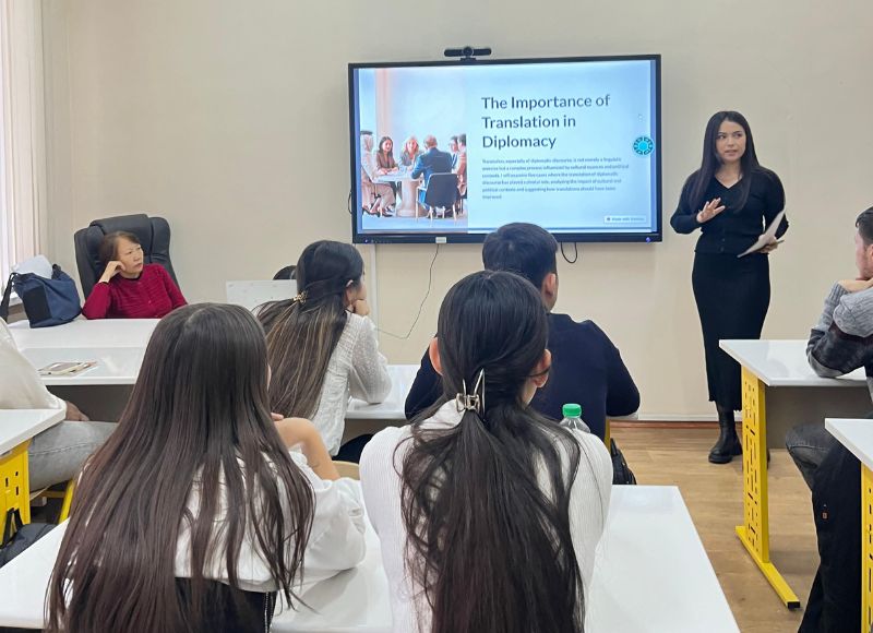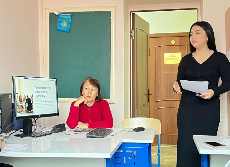 79th Scientific Conference of Undergraduate and Graduate Students of the speciality of translation studies The Department of Oriental Philology and Translation hosted a student scientific conference, the section "Translation and World Literature". It was attended by 30 students and 4 undergraduates specializing in "Translation". Based on the results of the presentations of the students, the jury consisting of Prof. Aigul Zhumabekova, Senior lecturer Nurzhamal Shengelbayeva, senior lecturer Karakat Duysenova, senior lecturer Kulzagi Ibrahimova determined the winners: the 1st place was taken by a 4th-course student Zhanerke Bektemir, the 2nd place was taken by Madi Ospanbekov (2nd course) and Nazerke Rizabekkyzy (1st course), the 3rd place was taken by Korkin Zakhar (4th course), Moldir Zhanybekkyzy (4th course) and Aida Nesipbek (1st course).
