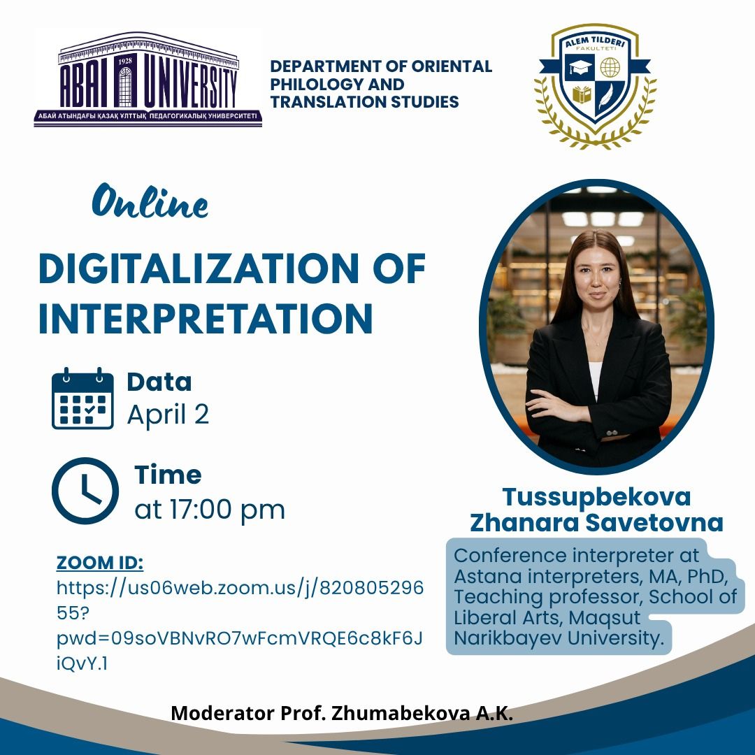 As part of the Decade of Science, a webinar was held on April 2, 2026, for undergraduate and graduate students in the Department of Oriental Philology and Translation Studies of the Faculty of World Languages. The speaker was Zhanara Sovetovna Tusupbekova, PhD, conference interpreter at Astana Interpreters, and lecturer in the Faculty of Humanities at Maksut Narikbayev University. The speaker discussed a new type of translation called augmented interpreting, which involves the work of an interpreter using artificial intelligence, and the tools used for this process, including Adobe Firefly, Gemini, Notebook LM, GrammarlyGO, Perplexity AI, Subtitles Service, and others. The webinar generated keen interest among the students, and many questions were asked. The meeting was moderated by Doctor of Philology Sciences, Professor Aigul Kazkenovna Zhumabekova.