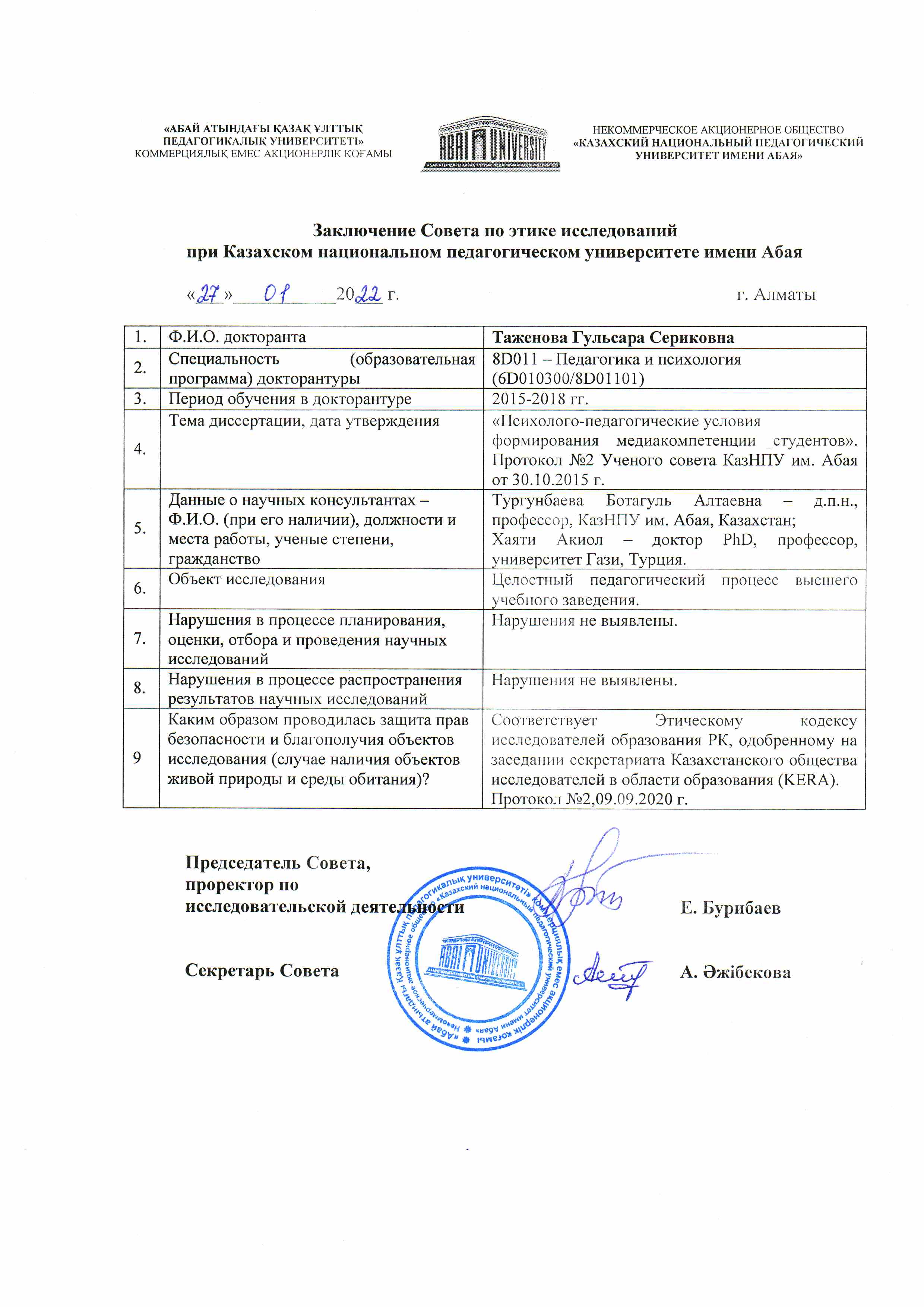 The defense will take place on February 28, 2022, at 11.00 at the Abai Kazakh National Pedagogical University. The address: 050010, Almaty, Dostyk Avenue 13. Main building (3rd floor, room 320) site:www.kaznpu.kz Contact number: +7(707) 9040795