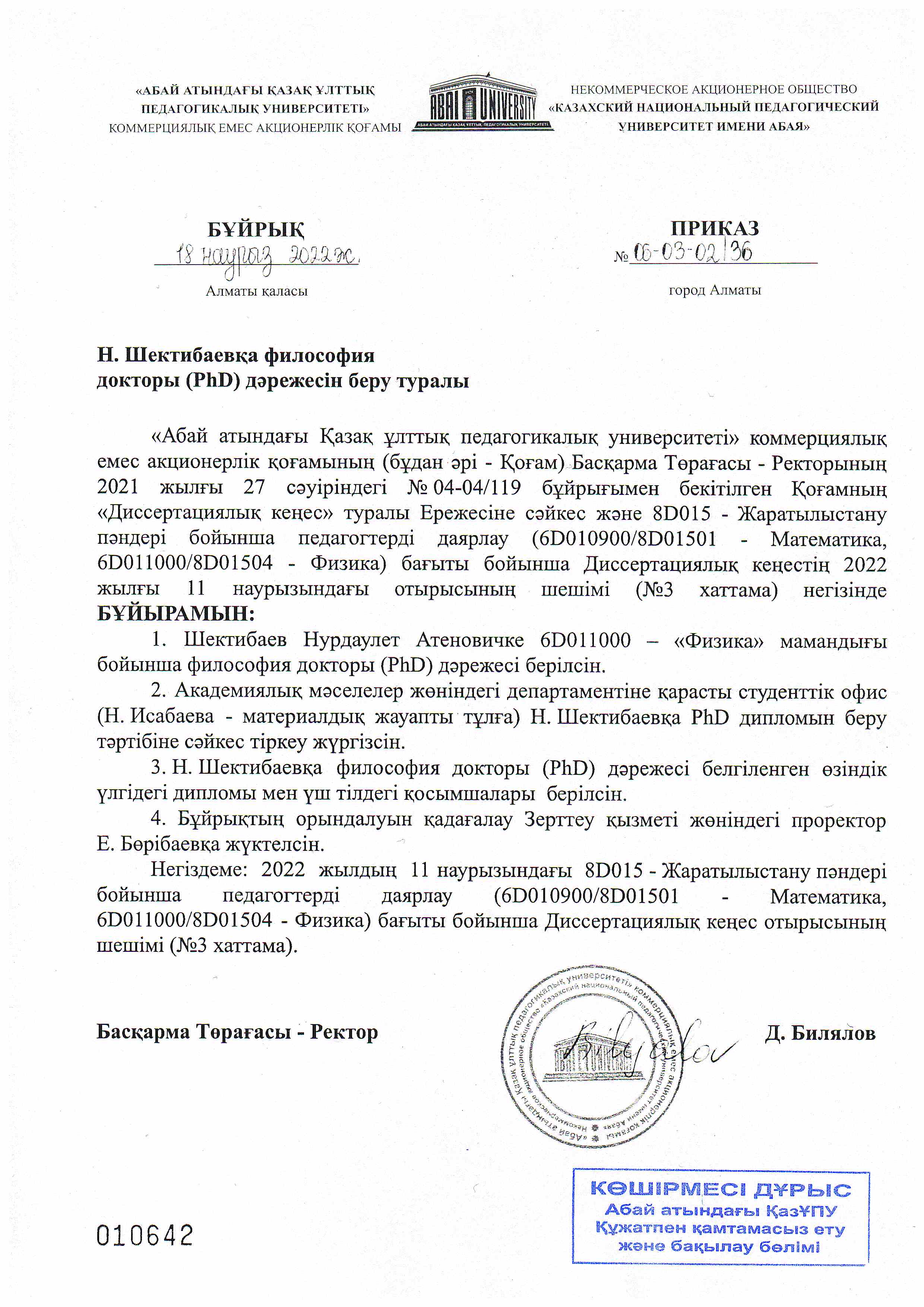 The dissertation council for the defense of dissertations for the award of the degree of Doctor of Philosophy (PhD) in the field of personnel training 8D015 Training of teachers in Natural science subjects (6D010900/8D01501 - Mathematics, 6D011000/8D01504 - Physics) at the Abai Kazakh National Pedagogical University will be defended the thesis of Shektibaev Nurdaulet Atenovich on the topic «Methods of development of subject competence of future physics teachers in teaching the elective course «Physics of the nucleus and elementary particles». The dissertation was completed at the Akhmet Yassawi International Kazakh-Turkish University.