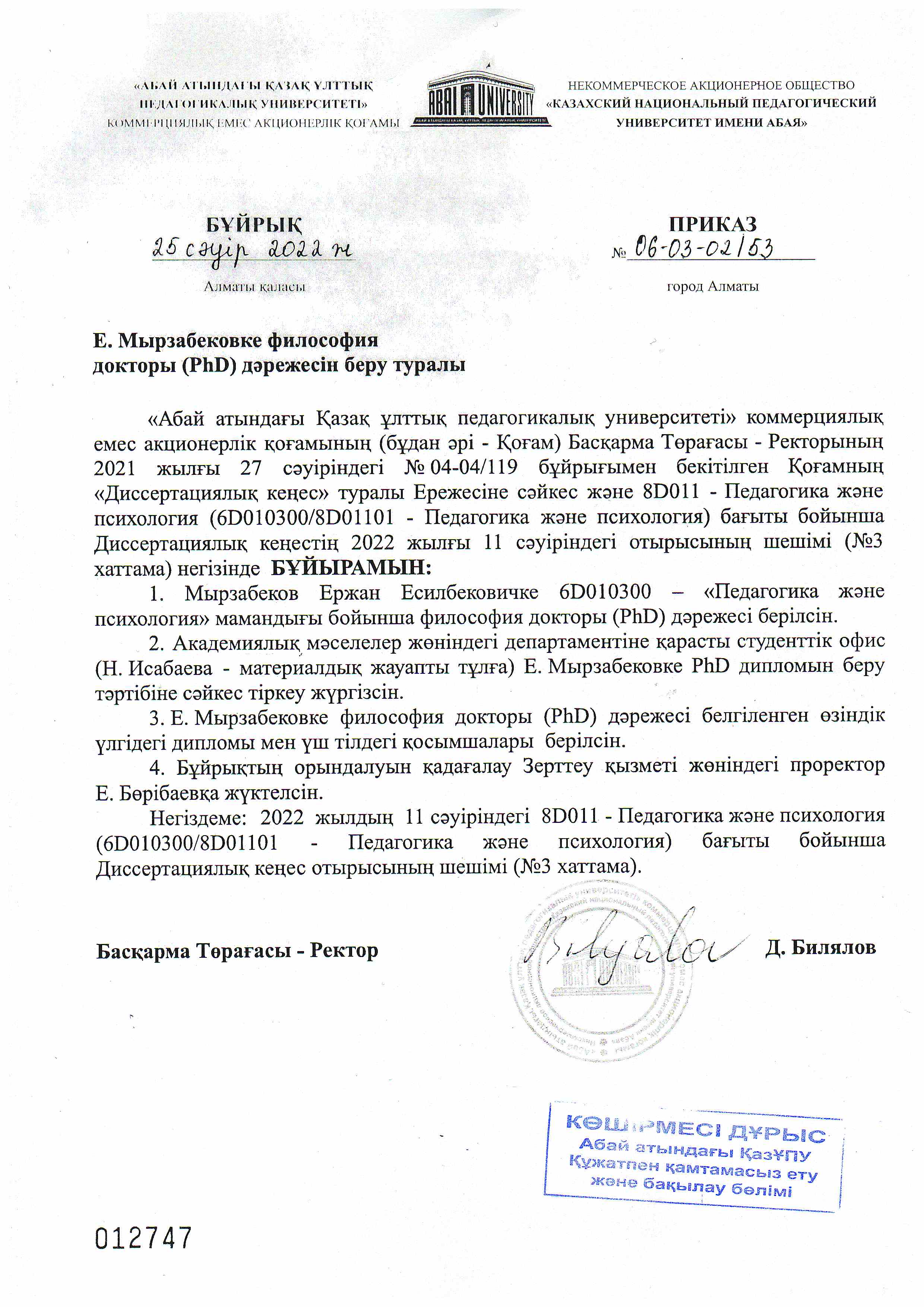 Order on awarding the degree of Doctor of Philosophy (PhD)