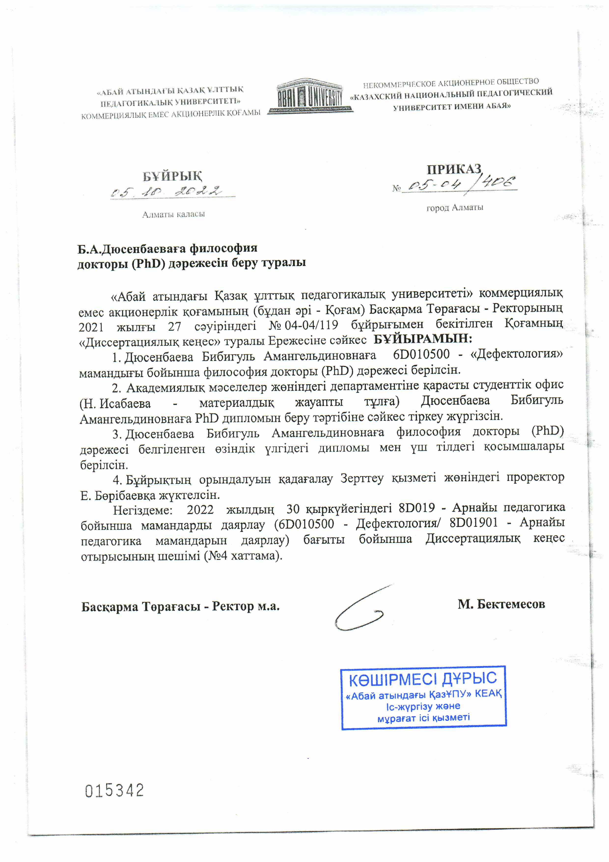 The dissertation was completed at the Kazakh National Pedagogical University named after Abai.