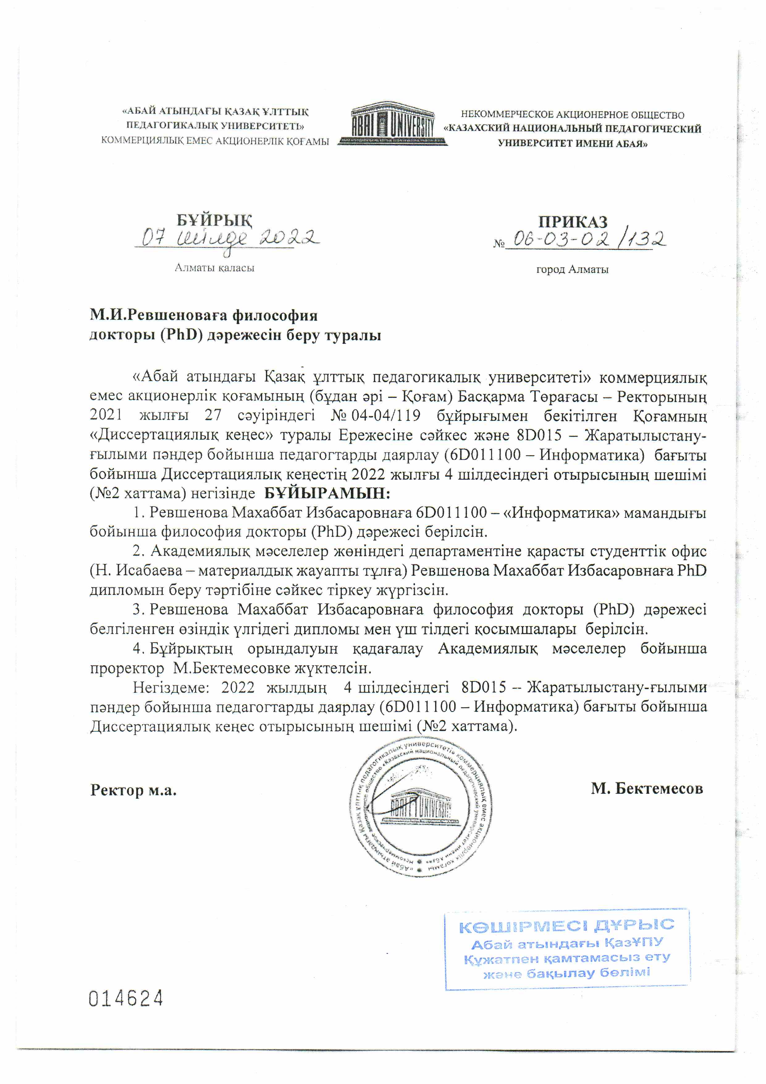 It is necessary to defend the degree of PhD dissertation work M. И. Revshenova The dissertation Council, created to award the degrees of Doctor of Philosophy (PhD) in the profile in the direction 8D015 - training of teachers in natural sciences (6D011100 - Computer Science) at the Abai Kazakh National Pedagogical University, will defend Revshenova Mahabbat Izbasarovna on the topic: "Development of professional competence of a future computer science teacher in teaching computational informatics".