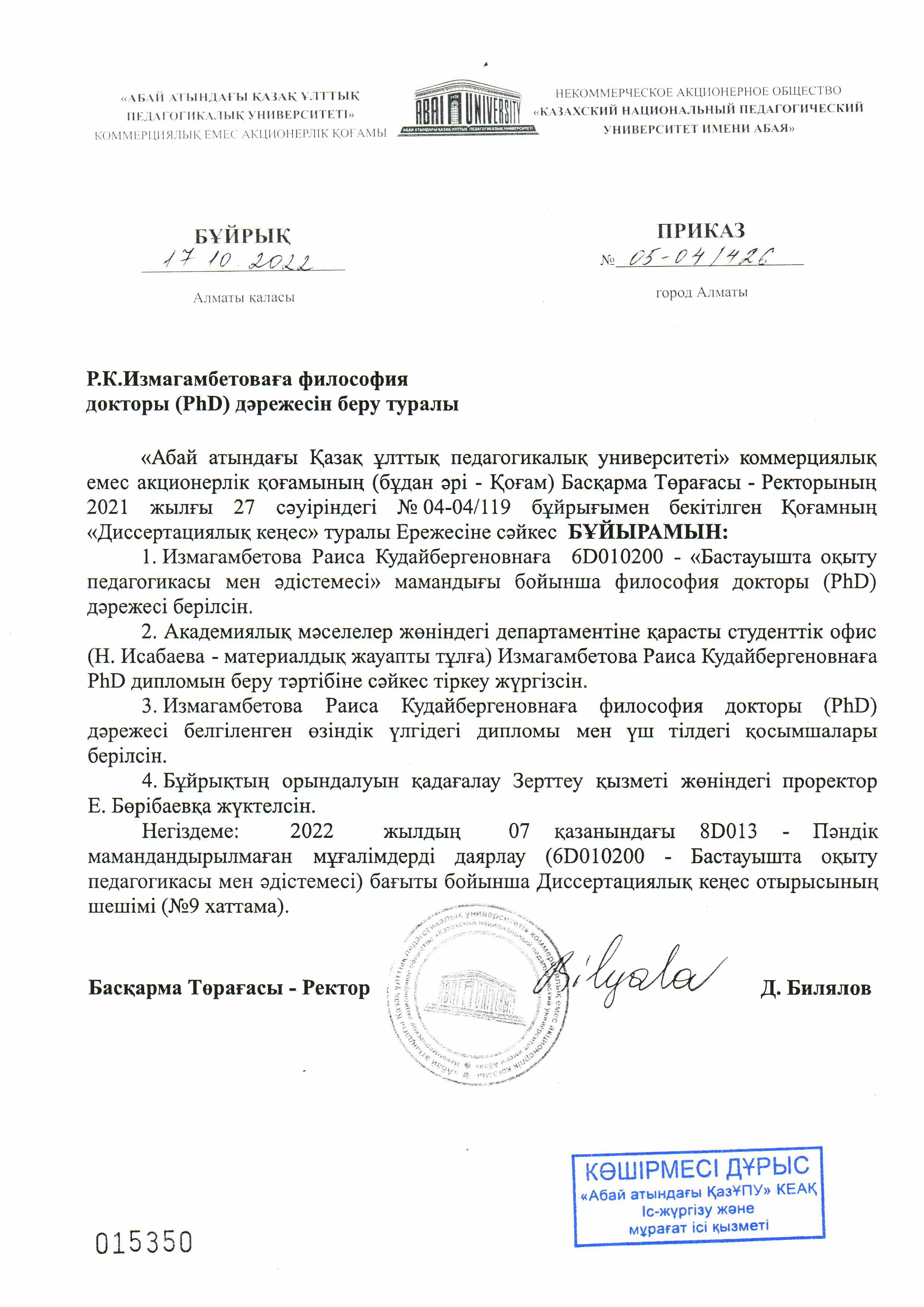 The dissertation was completed at the Abai Kazakh National Pedagogical University