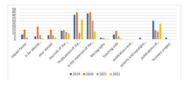 The results of scientific and scientific-methodical activities of teachers are embodied in monographs, textbooks and manuals, methodological developments. As a result of scientific research staff of the institute published 101 articles, including articles in publications with an impact factor - 16, in the publications of foreign countries - 21, neighboring countries - 16, in magazines of the list of publications recommended by the Committee for Quality Assurance in Education and Science of the RK - 14, in the publications of the RK - 41, in the materials of scientific conferences - 12. In addition, three monographs and 14 textbooks have been published.