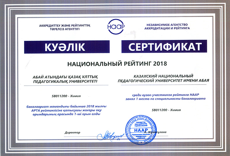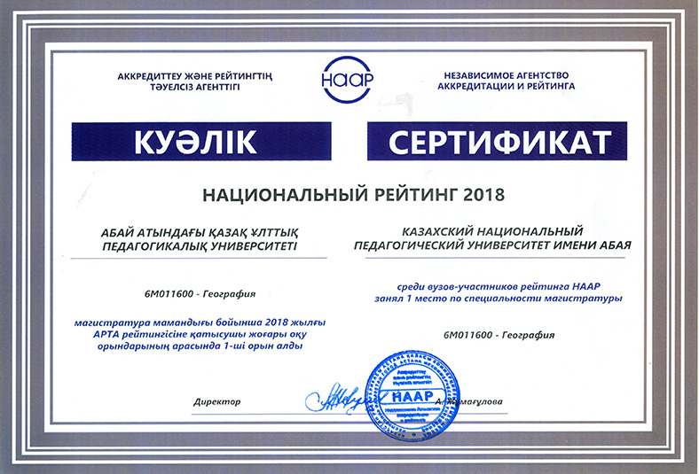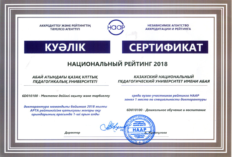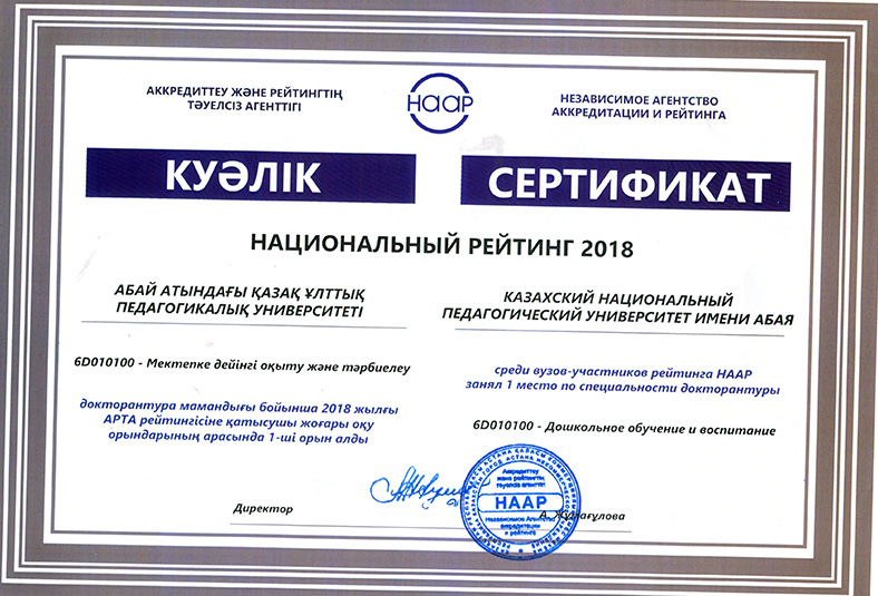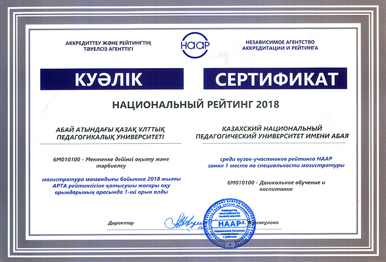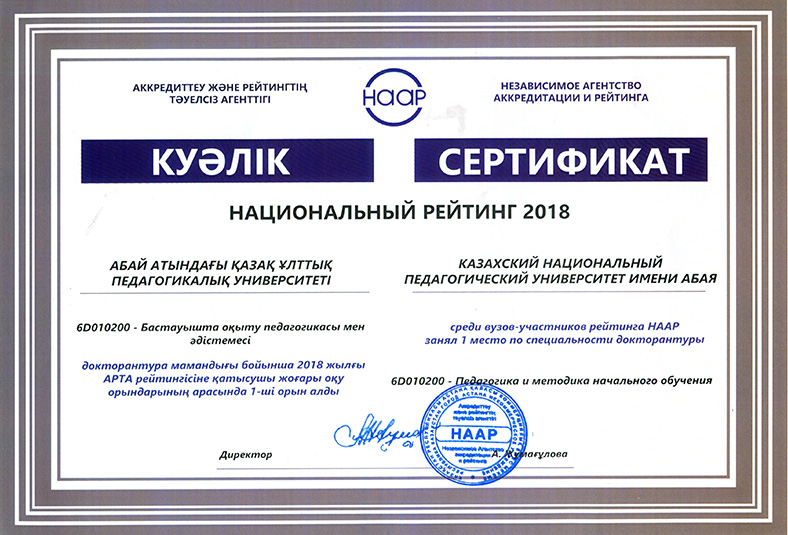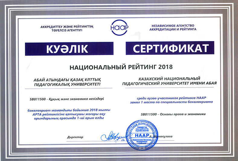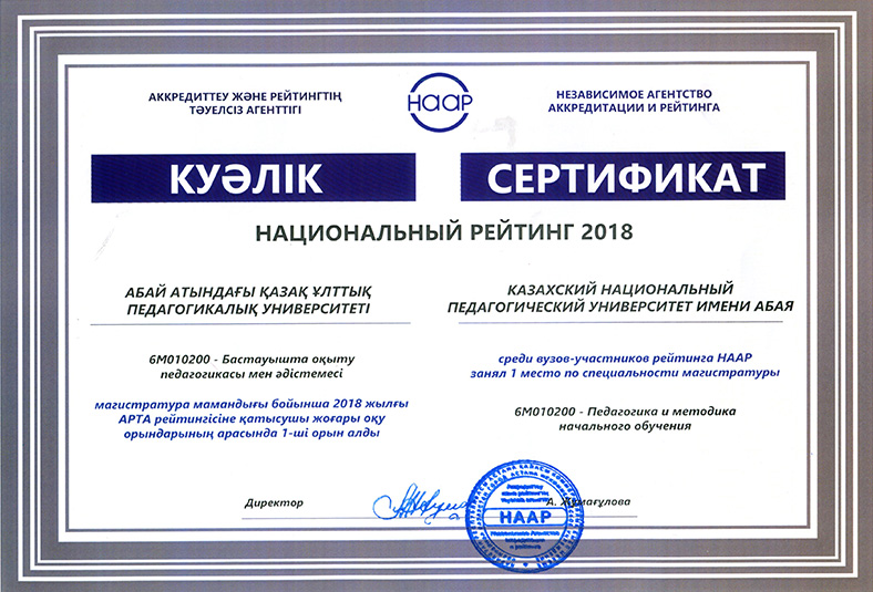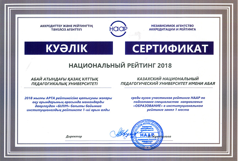 On 15 May, 2018 in the newspaper «Kazakhstanskaya Pravda» the results of the National rating of the demand for universities RK-2018, conducted by the Independent Agency for Accreditation and Rating (IAAR) were published. 58 universities participated in the rating. Abai Kazakh National Pedagogical University entered the General rating of TOP-20 universities of the Republic of Kazakhstan. In the institutional rating for the direction «Education» Abai KazNPU took first place, and in the direction of «Law» - 9th place. In the rating of universities on educational programs Abai KazNPU won 32 prizes, including under the bachelor`s program - 18, magistracy - 8 and doctoral studies - 6 places. The rating of universities on educational programs in accordance with the levels and areas of training of specialists: