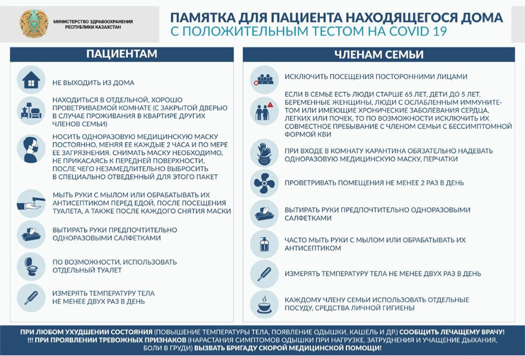 If you suspect a coronavirus infection: 1. Stay at home. If you feel worse, call a doctor, inform him about your places of stay in the last 2 weeks, possible contacts. Strictly follow your doctor`s recommendations. 2. Minimize contact with healthy people, especially the elderly and people with chronic diseases. It is better for one person to care for the sick. 3. Cover your mouth with disposable tissue or tissue when coughing or sneezing. If they are absent, sneeze in the elbow. 4. Use personal hygiene items and disposable dishes. 5. Provide damp cleaning with disinfectants and frequent ventilation.