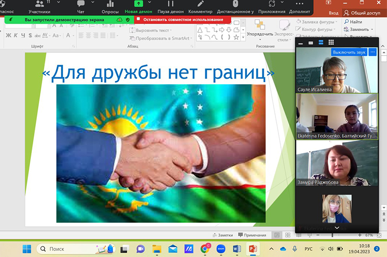 19 апреля 2023 года в КазПУ имени Абая состоялось второе международное практическое занятие-батлл «Для дружбы нет границ», в котором приняли участие студенты 2-го курса (ДОТ) специальности «Педагогика и психология», школьники Президентской школы г. Хивы, школы №1 пг. Ташлак Ферганской области и студенты Самаркандского государственного университета (Узбекистан).