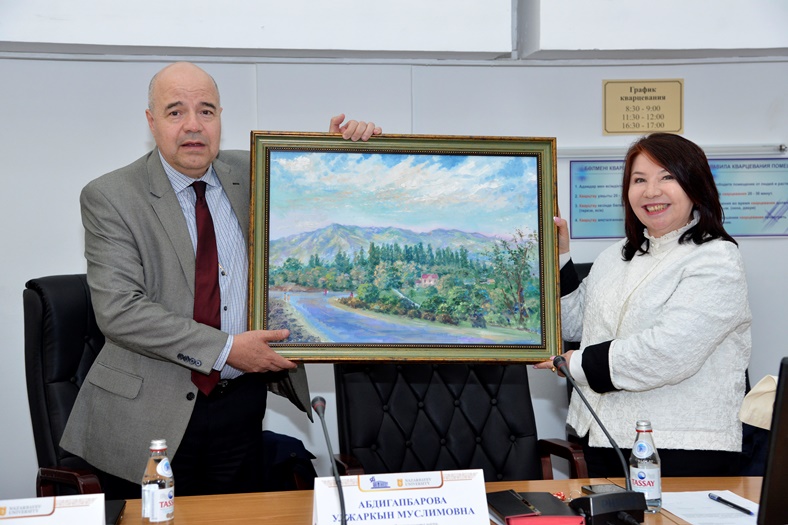 По завершении визита делегации Назарбаев Университета Улжаркын Абдигапбарова с пожеланиями дальнейшего сотрудничества вручила гостям памятные сувениры с символикой нашего университета.