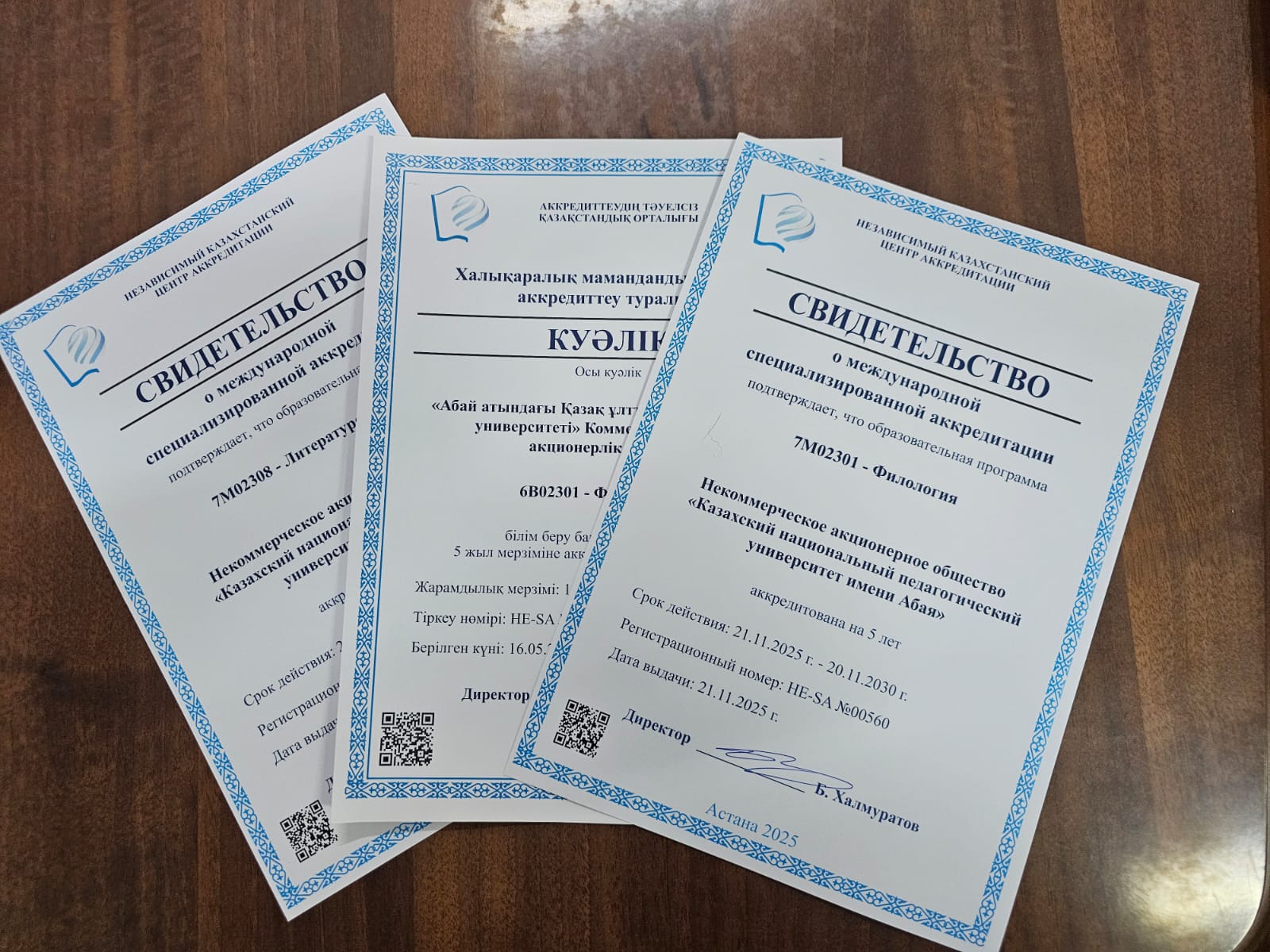 Наши образовательные программы кафедры успешно прошли аккредитацию! ✅ 6В02301 – Филология ✅ 7М02301 – Филология ✅ 7М02308 – Литературоведение Прохождение аккредитации является убедительным подтверждением высокого качества образования, полного соответствия учебных программ современным требованиям и нашей ответственности в подготовке будущих специалистов. Это достижение — результат кропотливого труда профессорско-преподавательского состава кафедры, стремления обучающихся к знаниям и системной совместной работы, направленной на достижение общих целей. Искренне поздравляем всех коллег, обучающихся и выпускников с этим значимым успехом!