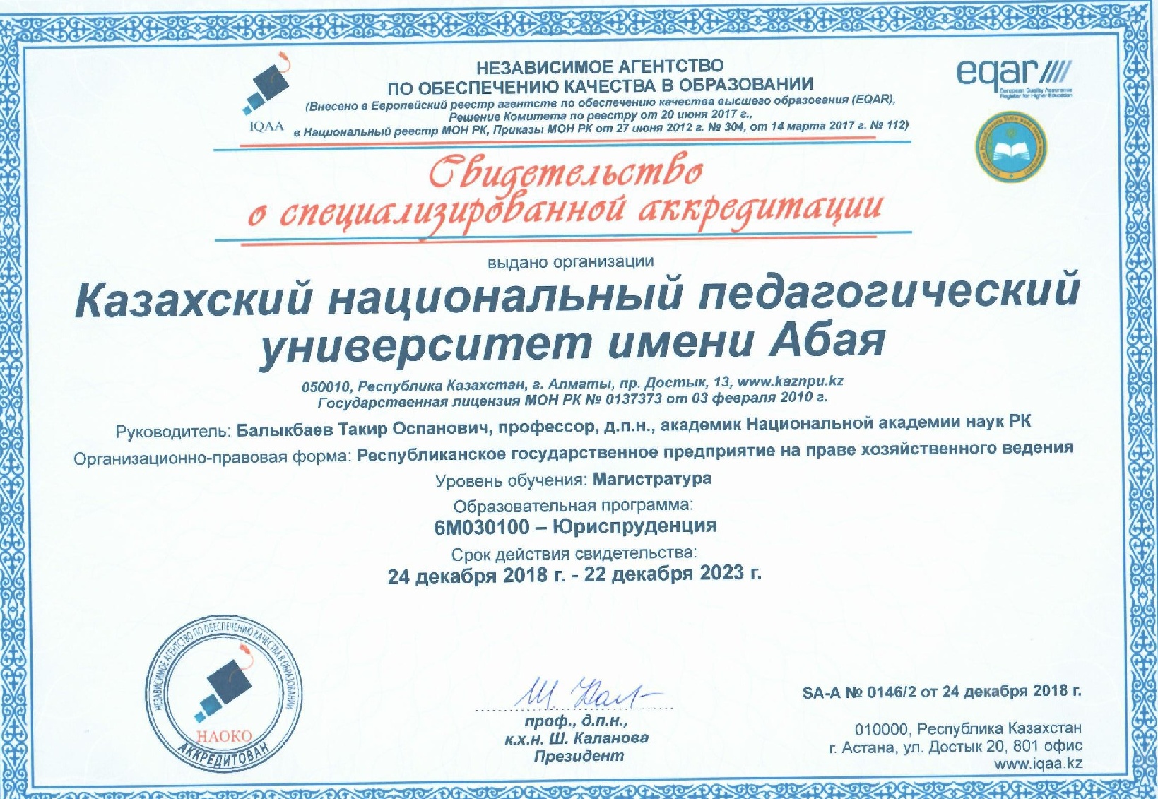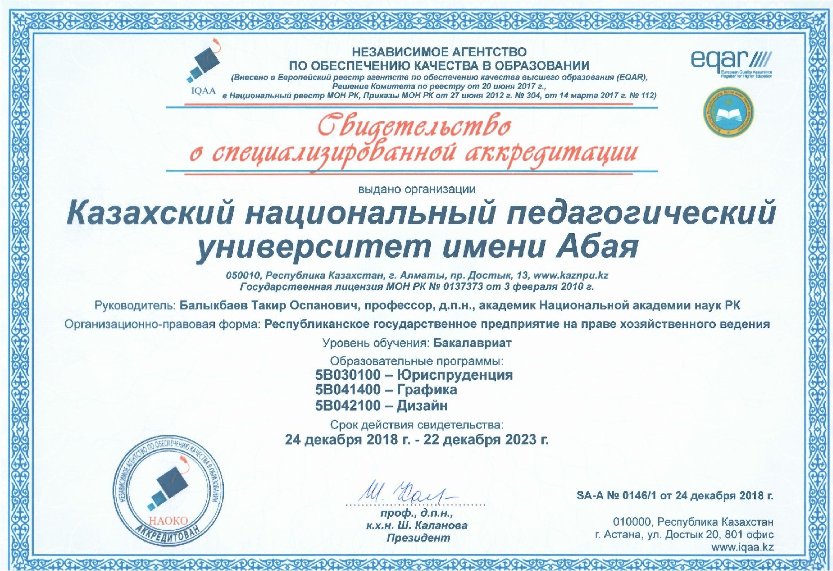 Abai University in 2018 successfully passed the program (specialized) accreditation in the Independent Agency for Quality Assurance in Education (IQAA) for a period of 5 years.