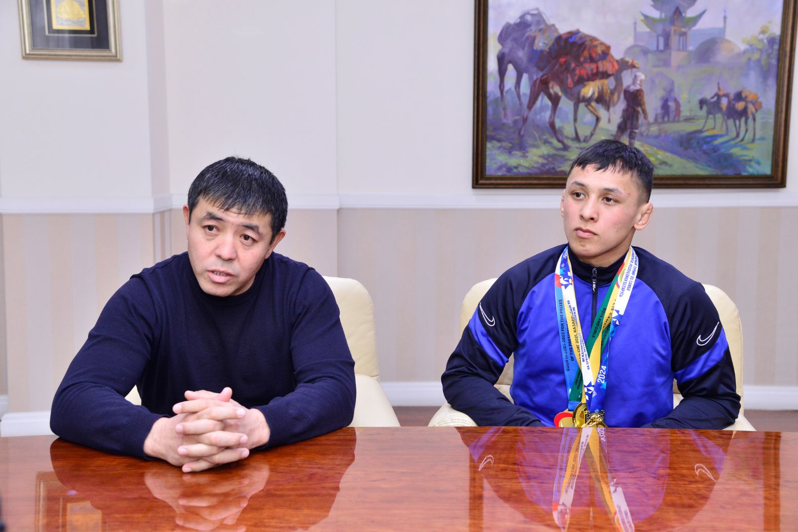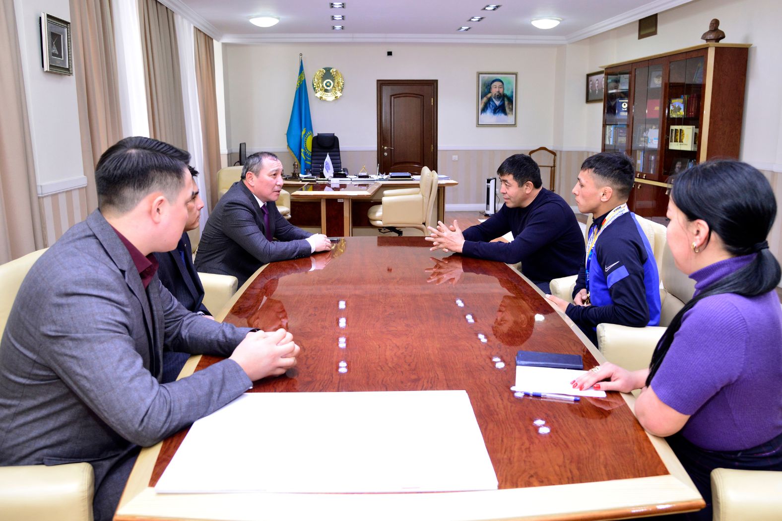 The Rector sincerely congratulated Nursultan on his victory and wished him new sporting heights. Bolat Tlep emphasised the importance of supporting talented students of the university and expressed readiness to support young athletes. He expressed his gratitude to Nursultan and his coach and presented them with a monetary certificate from the university.