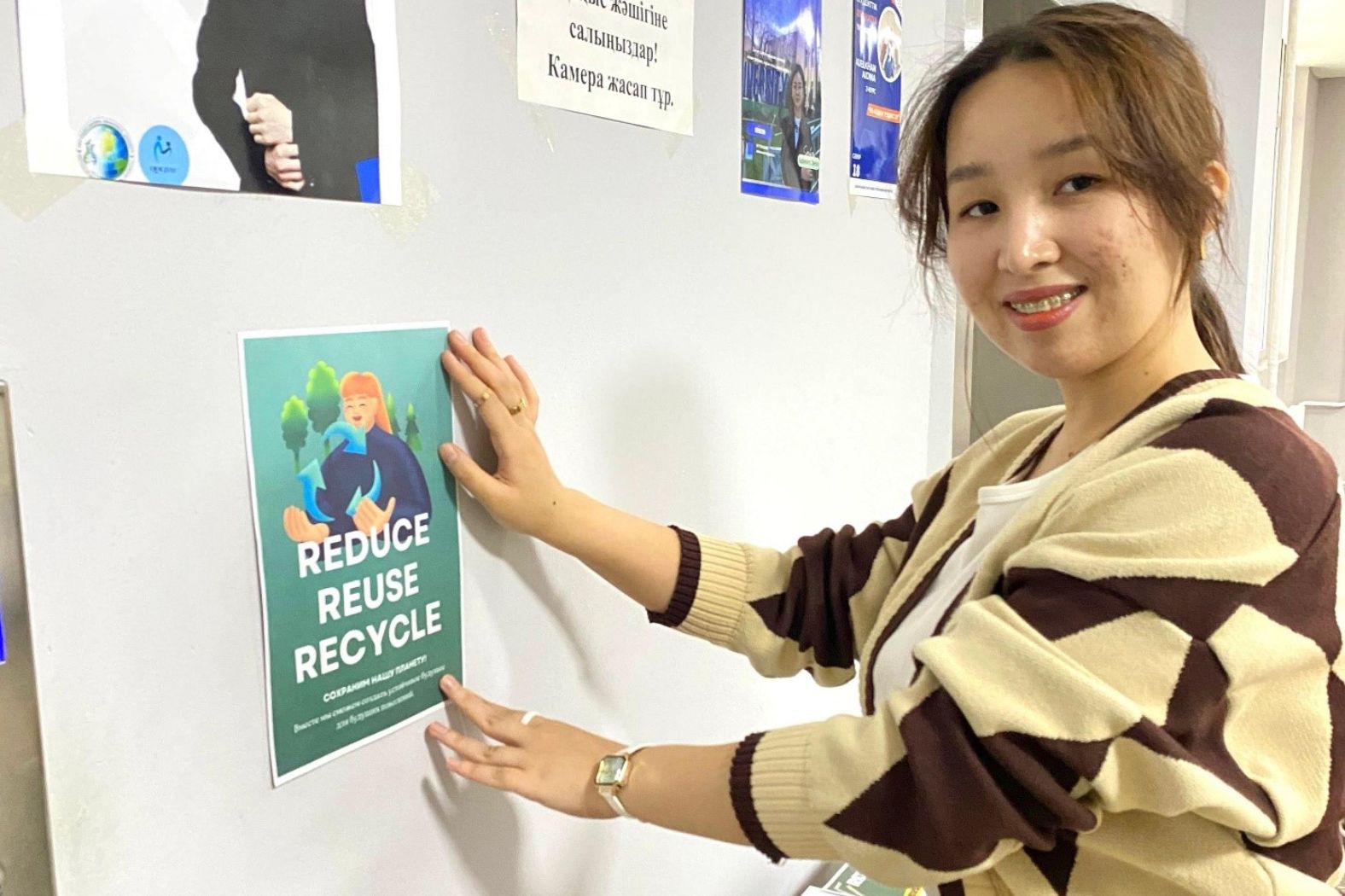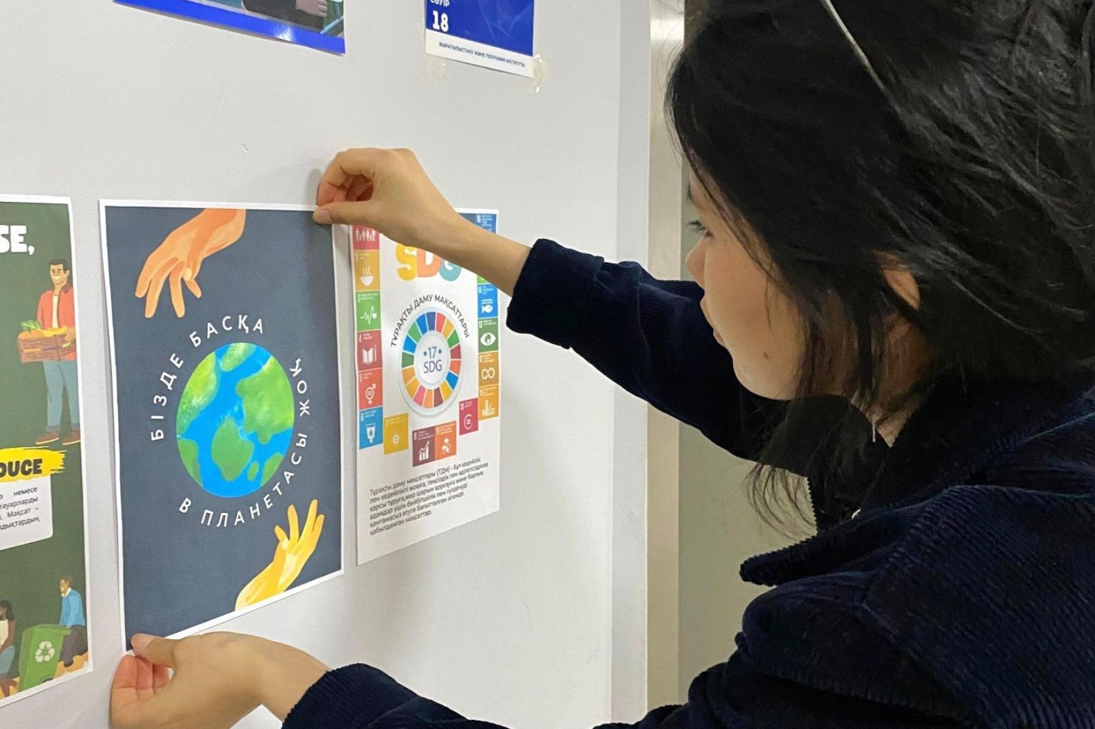 Activists of the eco-club "Ayala": Zhumagali Nazerke and Altynbekova Aidana in order to raise the level of environmental culture among students of Abai KazNPU and attracting students` attention to environmental problems carried out work on hanging posters of environmental content on the 6.5 floors of the Institute of Natural History and Geography (INGI).