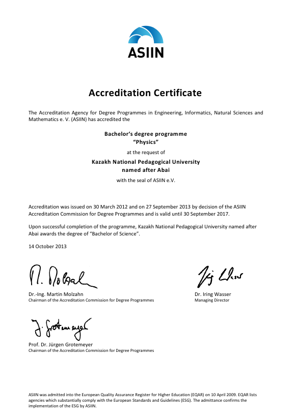 18.10.2013 ASSIN (Германия) орталығымен бакалврдағы 5В011000-физика және 5В011100-информатика білім бағдарламаларының халықаралық аккредитациясын 2017 жылдыің 30 қыркүйегіне дейін ұзартуымен "Математика, физика және информатика" институтын құттықтаймыз :
