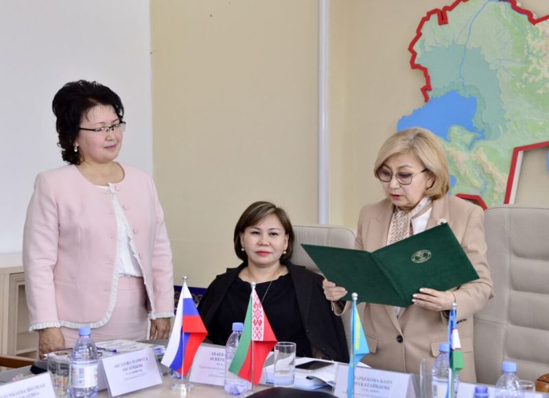B.Narbekova, noting the scientific and professional achievements of the scientist: under the guidance of Professor M.Absatova, 6 PhD doctors, more than 53 masters of pedagogical sciences were trained, more than 450 scientific papers were published, the best teacher of the University-2012, graduate of the international Bolashak program, Digital teacher of KazNPU named after Abai, performer of more than 6 projects of fundamental, applied and intra-university, and is currently the head of the grant financing project, presented the badge of the NGO "Gylymdy damytuga sinirgen enbegi ushin" and a letter of thanks.