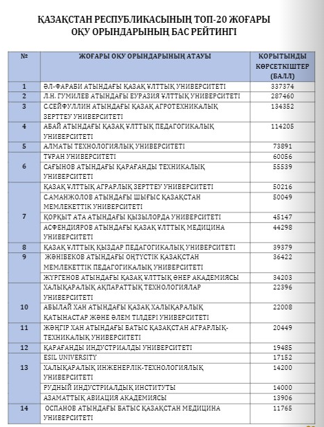 According to the results of the General Rating of the "TOP 20" universities of the Republic of Kazakhstan, Abai KazNPU took the 4th place.