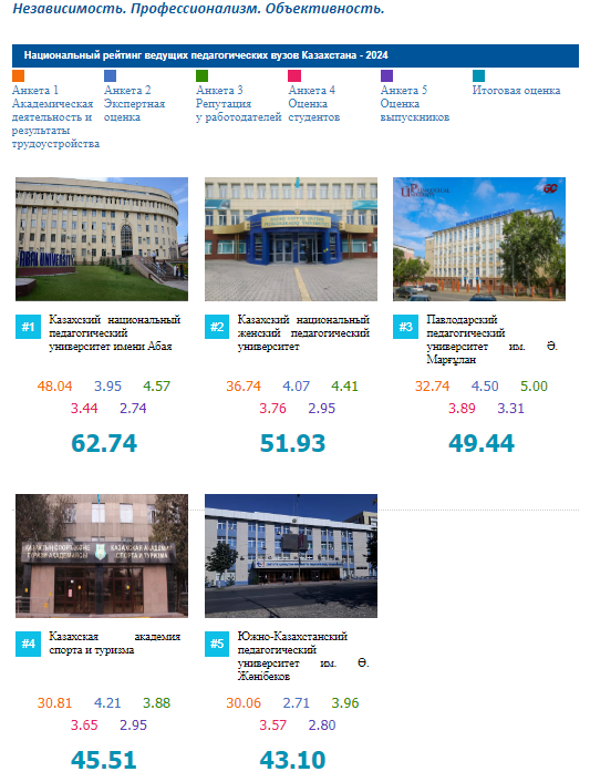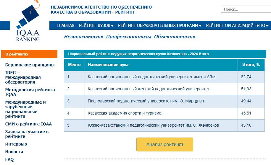 The ndependent Agency for Quality Assurance in Education (IQAA) summed up the results of the National Ranking of the best universities in the Republic of Kazakhstan. Among the pedagogical universities in the 1st place is the Abai Kazakh National Pedagogical University.