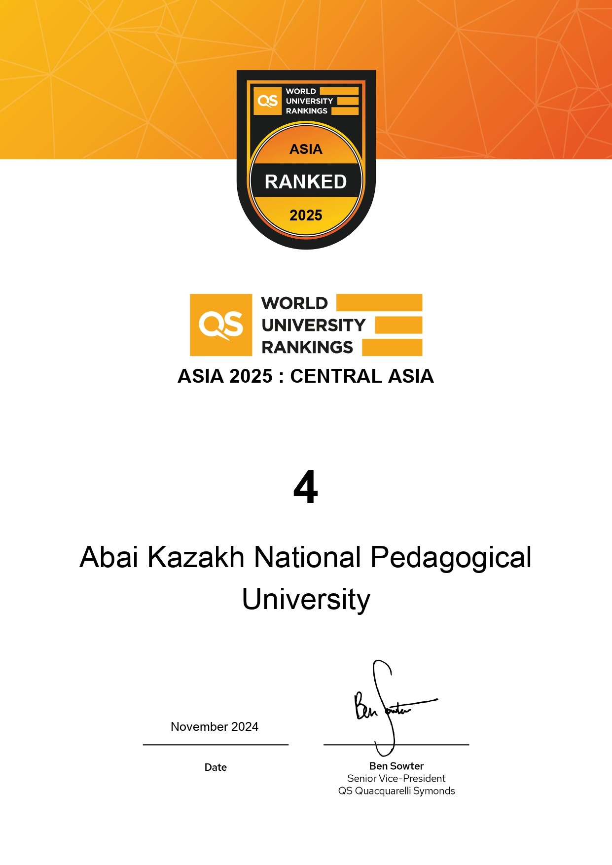The higher education sector in Kazakhstan has demonstrated unprecedented progress, with 3 universities entering the top 100: Al-Farabi KazNU (29), L.N. Gumilyov ENU (65), and Satbayev University (89). The fourth place among universities in Kazakhstan and Central Asia is occupied by Abai KazNPU.
