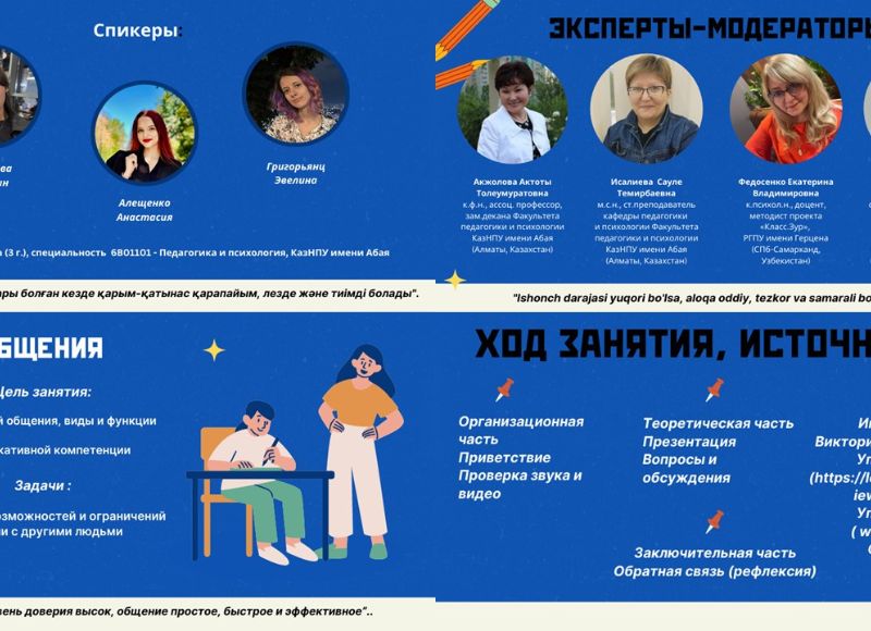 The organizers of the marathon are the Candidate of Philological Sciences, Associate Professor, Deputy Dean for Academic Affairs of the Faculty of Pedagogy and Psychology Aktoty Akzholova, Master of Social Sciences, Senior Lecturer of the Department of Pedagogy and Psychology Saule Issaliyeva (Abai KazNPU), Candidate of Psychological Sciences, Associate Professor, Methodologist of the "Class.Zur" project Ekaterina Fedosenko, Senior Lecturer at the Center of Pedagogical Excellence in Samarkand and the Samarkand region Raimkulova Irina (Uzbekistan).