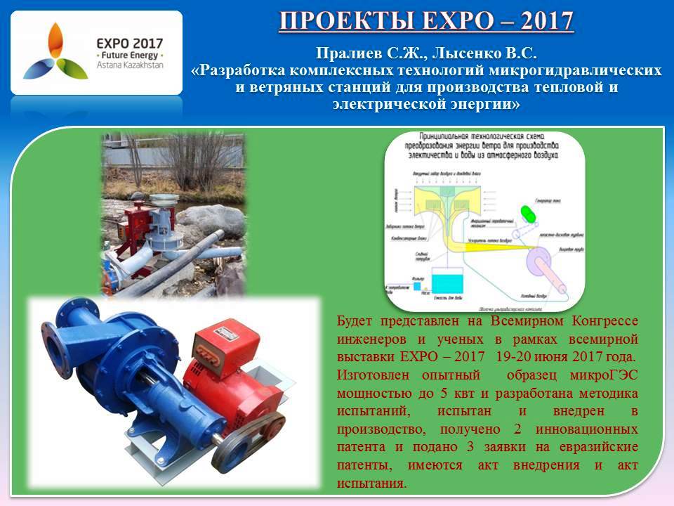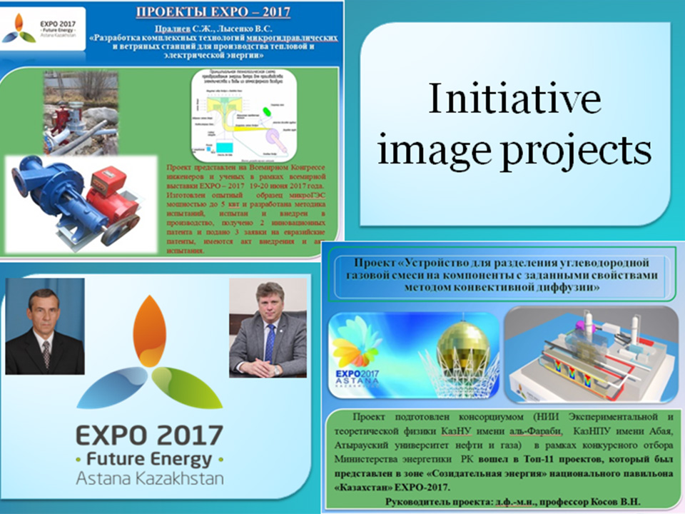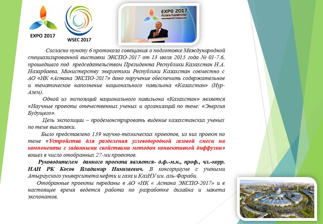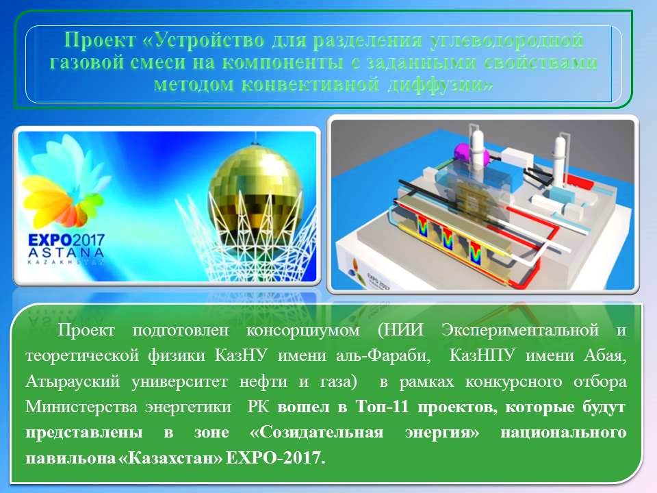The innovative project "Device for the separation of a hydrocarbon gas mixture into components with specified properties by the convective diffusion method",which was presented at the Kazakhstan exposition "Creative energy" in the National pavilion "Nur-Alem" at the international exhibition EXPO-2017, Astana. The project manager: correspondent - member of the NAS RK, Doctor of Physical and Mathematical Sciences, Professor Vladimir Kossov.