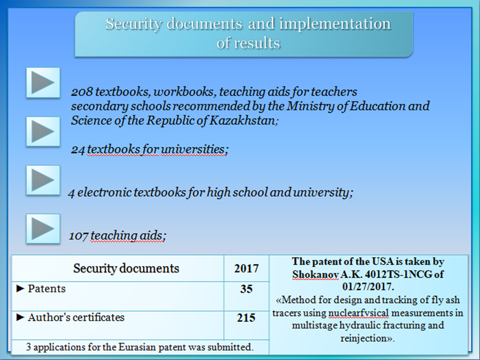 Scientists of the university support 35 patents and 215 copyright certificates for innovative developments. In 2017, 3 new patents and 15 copyright certificates were received. In 2017 US patent was received: Shokanov A.K. 4012TS-1NCG from 27.01.2017. Method for design and tracking of flyashtracers using nuclear fysical measurements in multistage hydraulic fracturing and reinjection.