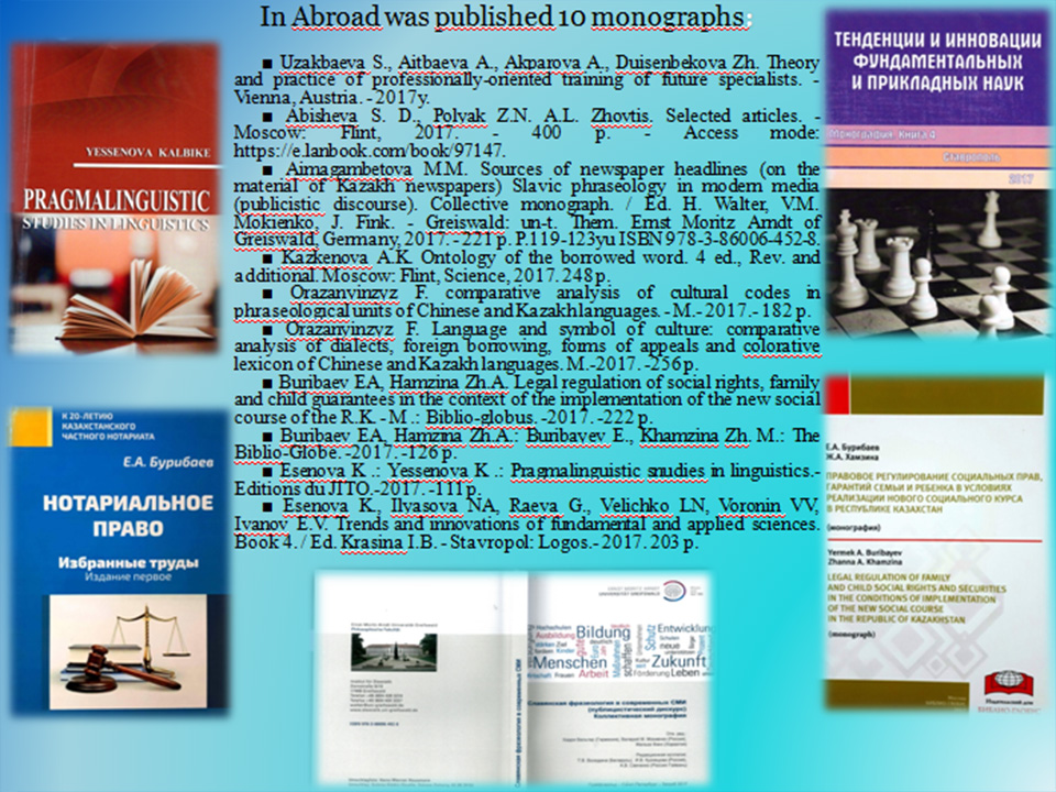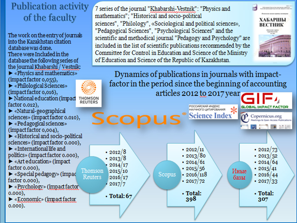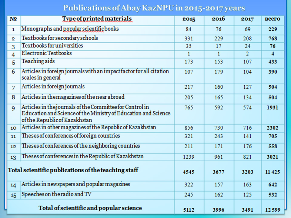 The university is working on the protection of intellectual property rights. Thus, in the period 2003-2015 teachers received 31 innovative patents, 149 copyright certificates. Patents are received in the field of innovative technologies in energy, space, environmental protection. Author`s certificates are received, basically, on textbooks for secondary school, approved and recommended by the Ministry of Education and Science of the Republic of Kazakhstan, for software products in the field of e-learning, monographs.