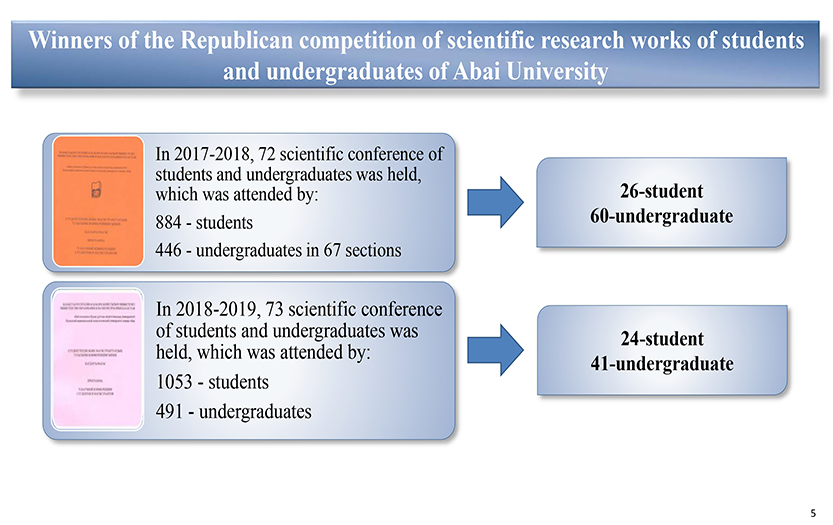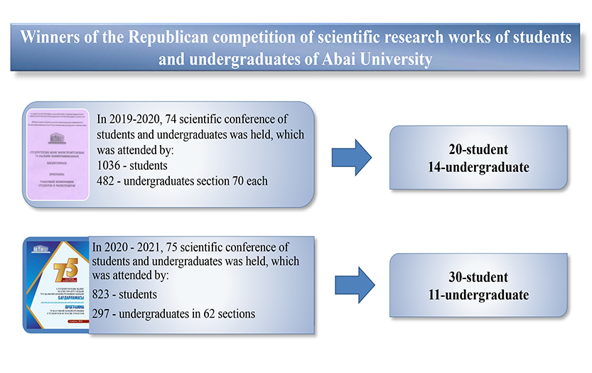 Scientific-research work of students in Abai KazNPU is conducted in accordance with the plans of university research in the following areas: Student participation in the annual competition of the Corporate Fund of Education Kazakhstan; Student participation in the annual competition of the Fund of the First President of the Republic of Kazakhstan; Organization and holding of the annual scientific student conference as one of the tour of the Republican contest of research works of students; Organization and holding of the 2nd round of the annual Republican competition SRWS under the heading "Education"; Working in 52 scientific circles in the educational institutions and faculty; Participation in the annual contest among the best students of pedagogical specialties for the award KazNPU named after Abai; Student participation in the annual contest Intrahigh Research Grants Rector KazNPU named after Abai; Student participation in the international, national, inter- and intrainstitutional competitions, contests, student conferences, round tables, etc.