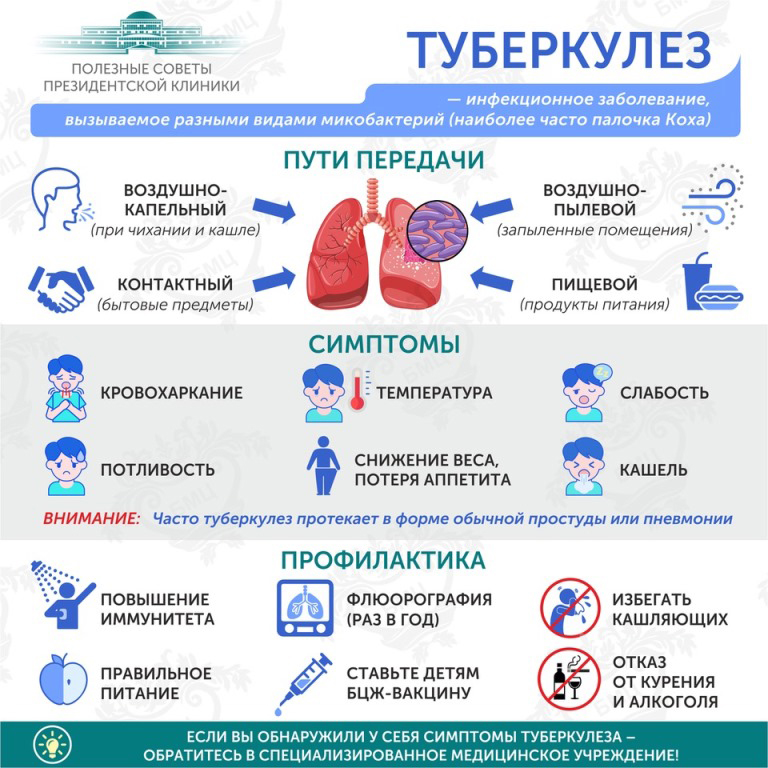 How does one get infected with tuberculosis? The main source of infection is a person who has pulmonary tuberculosis. Sputum containing Mycobacterium tuberculosis is secreted from the respiratory tract, especially during coughing. Small droplets of sputum can enter the respiratory tract of a healthy person nearby and settle on the floor or ground, on objects and belongings. Infection can also be passed on through poor hygiene - for example, by not washing your hands after touching the handrails on public transport, or by eating unwashed fruit and vegetables, poorly processed meat and unboiled milk.