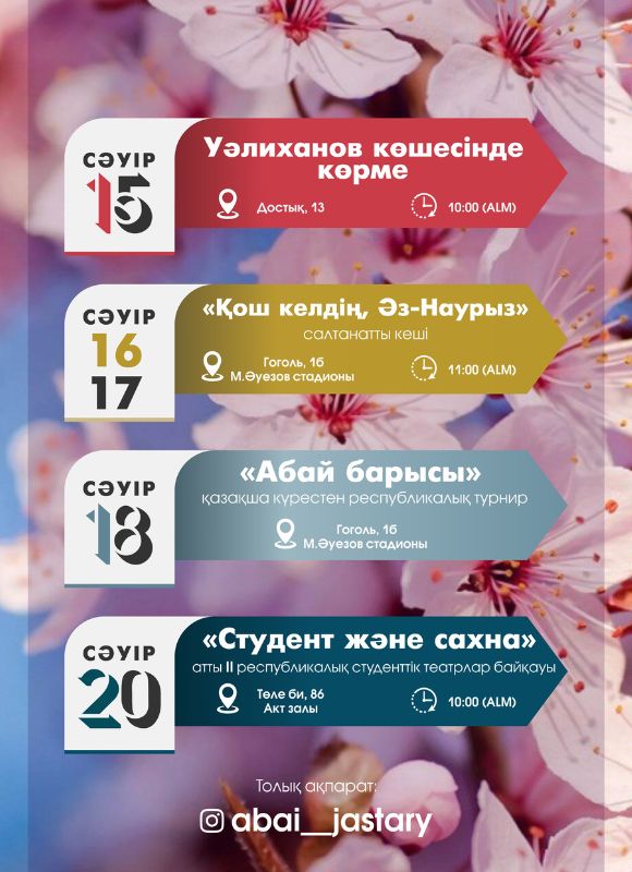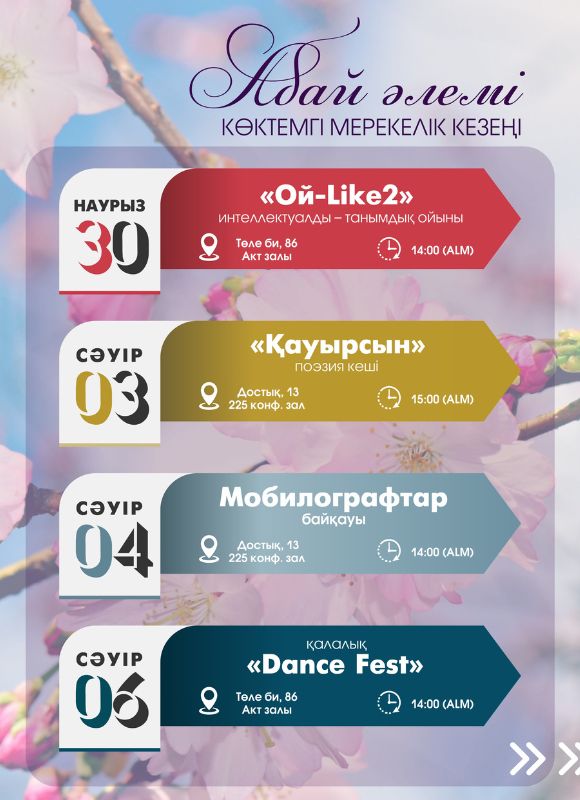 The events of the spring festive period" Abay Alemi " will last from March 30 to April 20. The event stage consists of 13 events. They are: