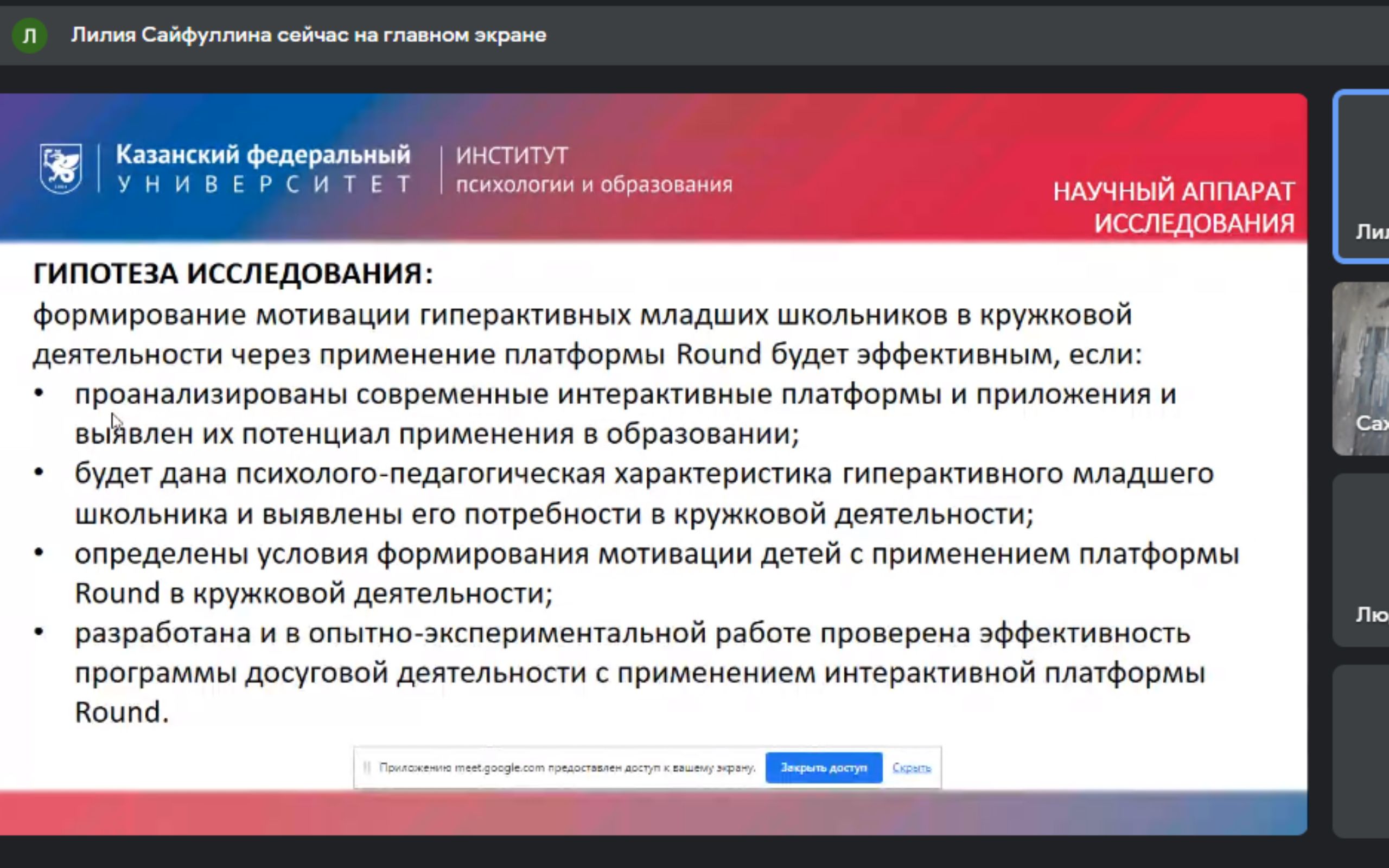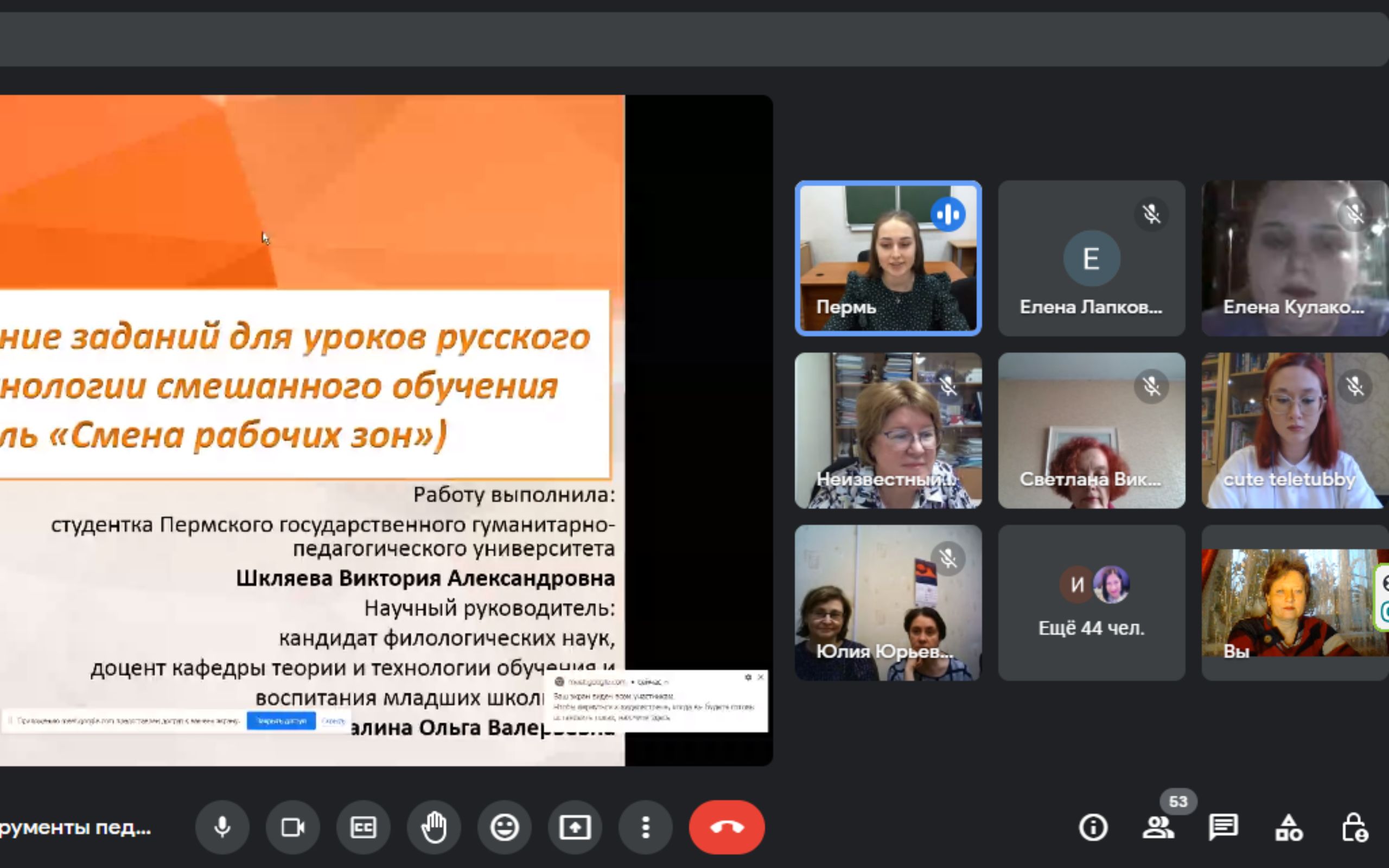The reports were made by V. Shklyaeva «Task design for the Russian language lessons in the technology of mixed learning (model «Changing zones»)»; Y. Khusnutdinova «Designing tasks on electronic platforms and application in the lessons «The world around us»; E. Kulakova, K. Degtyareva, A. Kemelkhanova - «Multimedia products in primary school lessons»; S. Manapova, G. Ilakhunova, Z. Shintore - «Using digital technologies in studying section of mathematics «Values and their units» in 2nd grade»; L. Sayfullina, L. Kayumova - «Psycho-pedagogical conditions of using Round platform for forming motivation of hyperactive junior schoolchildren in hobby groups»; I. Zharkovskaya, V. Zakirova - «Innovative technologies of video studio of Kazan Federal University Institute of Educational Psychology: work of students and teachers»; E. Pokhorukova - «Using digital technologies in teaching mathematics to elementary school students»; V. Karyakina - «Geoboard as a tool for developing communication skills in extracurricular activities of elementary school students»; A. Galiamova - «Digital tools in primary schools: from information to knowledge, from knowledge to practice».