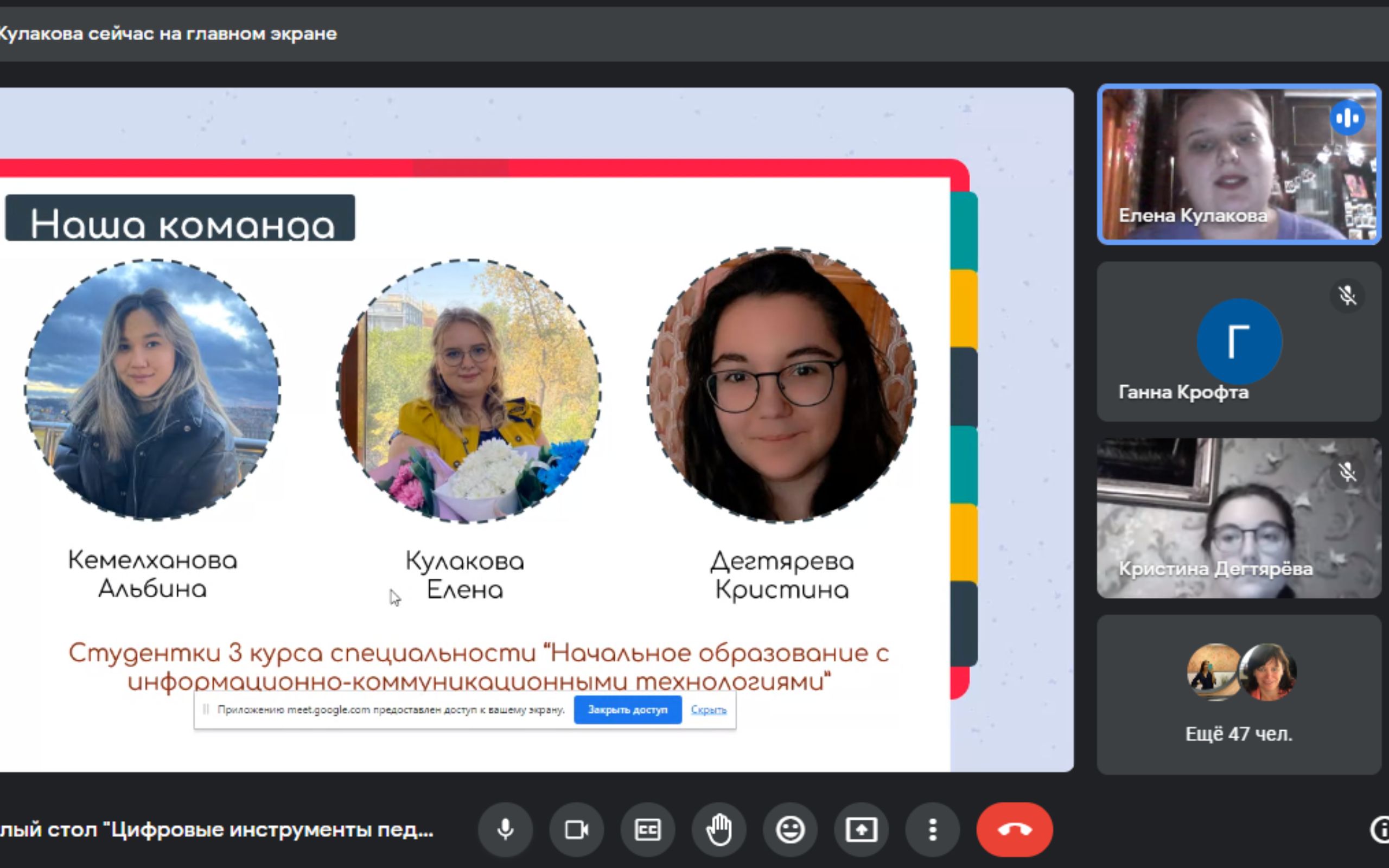 The students of Perm State University of Humanities and Education, Kazan Federal University, Altai State Social and Pedagogical University named after V. M. Shukshin, Samara State Social and Pedagogical University, Volgograd State Social and Pedagogical University (Russia) and Abai KazNPU shared their experience of using digital tools in preparing lessons and organizing cognitive activity of students within the subjects of primary schools.