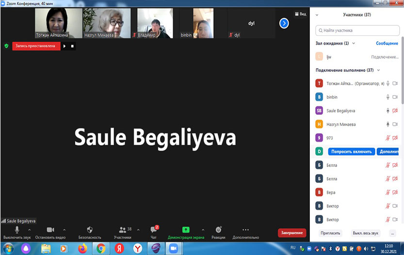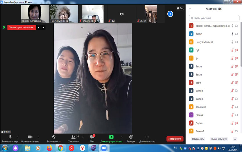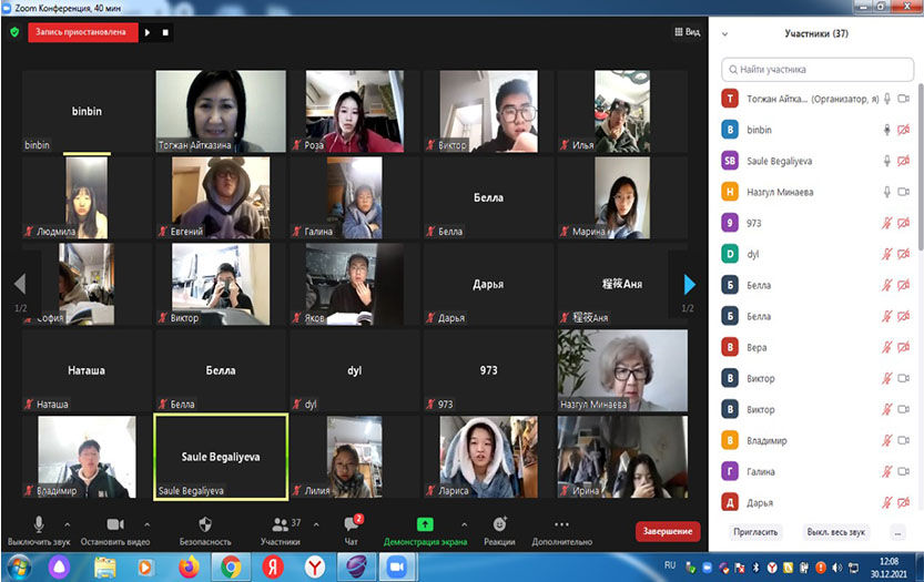 2021 жылдың 30 желтоқсанында ЮЕСЮ Чжэцзяндық шет тілдер институтының оқытушы, студенттерімен онлайн кездесу өтті. Аталған пәндер бойынша емтихандардың қорытындысы шығарылып, одан әрі ынтымақтастық перспективалары талқыланды.
