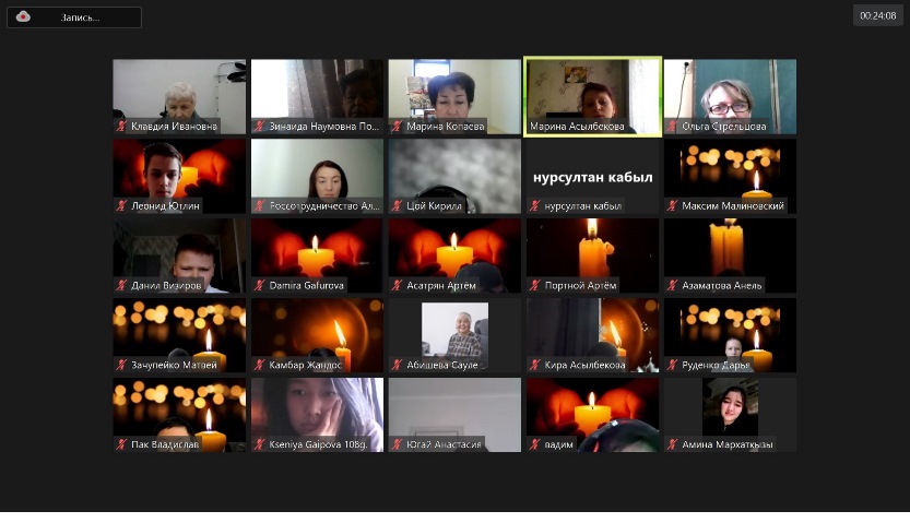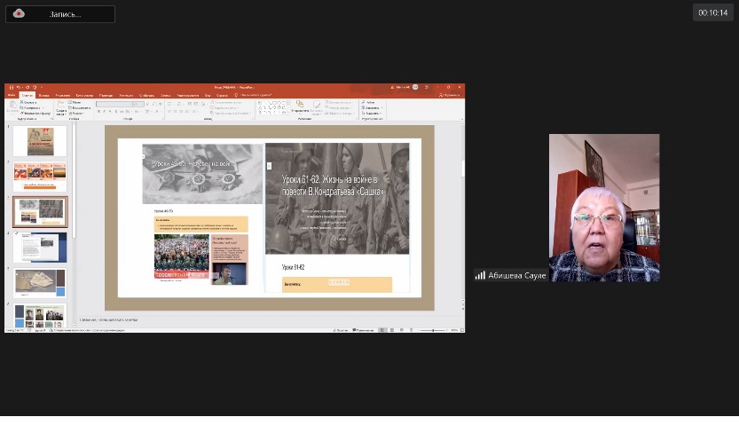 Орыс тілі мен әдебиеті кафедрасының меңгерушісі Сәуле Әбішева кеш қатысушыларына қазақстандық оқушыларға арналған әдебиет бойынша оқулықтың тарауларын көрсетті, онда соғыс туралы басқа ақындық шығармалар арасында А.Твардовскийдің «Я убит под Ржевом» өлеңі ұсынылды.