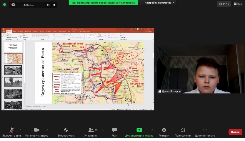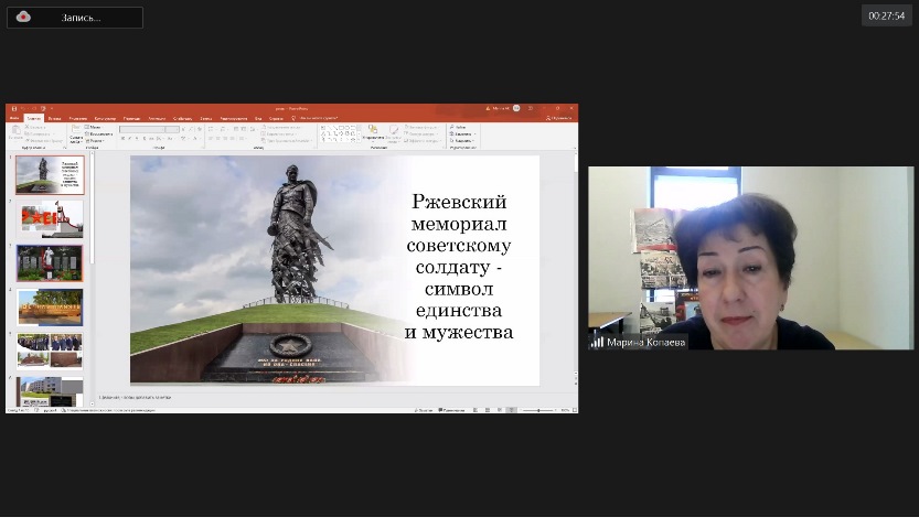 Оқушылар мен студенттер Ресей мұражайлары қызметкерлерінің өнерін үлкен қызығушылықпен тыңдады. Жеңіс мұражайының (Ресей) Ржев филиалының меңгерушісі Марина Копаева Кеңес әскерлерінің шабуылдау операциялары туралы, 13 айдағы қанды шайқастар туралы, соғыстың одан әрі дамуы үшін осы шайқастардың маңызды мәні туралы айтты. Бұл шайқастарға Қазақстанда құрылған 100 және 101 атқыштар бригадалары қатысты.