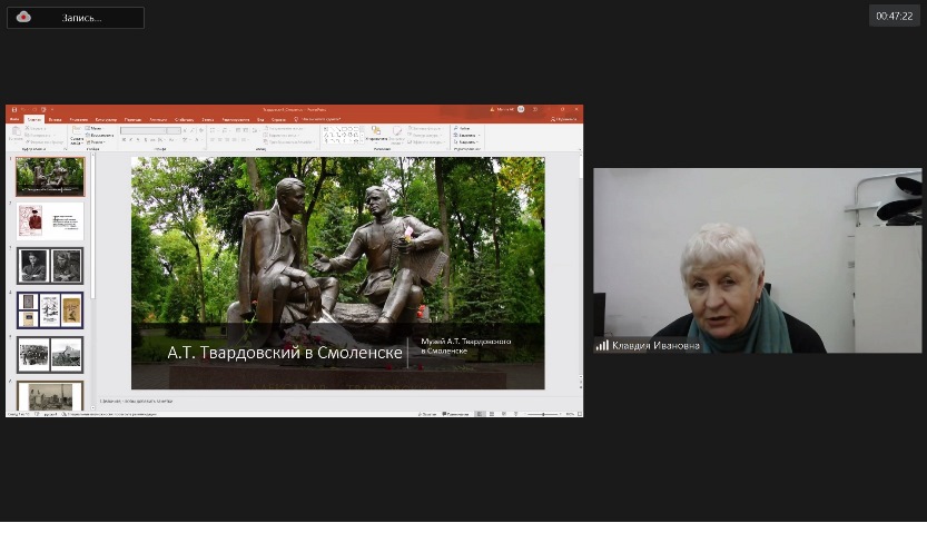 Клавдия Дурындина, тарих бөлімінің сектор меңгерушісі, А.Т.Твардовский Смоленскіде» (Ресей) мұражай қабырғасындағы соғыс туралы естеліктерді сақтау және тамаша ақынның өмірбаянының әскери парақтары туралы айтты.